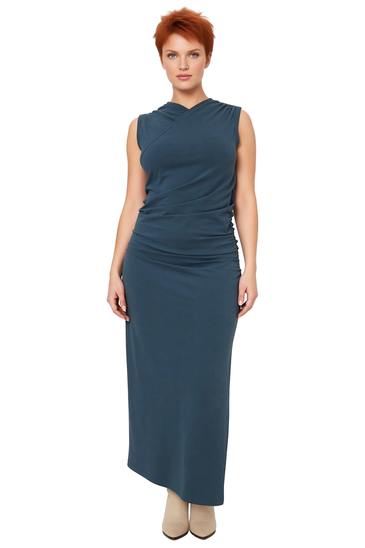Bu Kadın Kruvaze Yaka Yanları Büzgülü Kolsuz Maxi Elbise, modern ve çağdaş bir tarz sunarak gündelik şıklığınızı tamamlar. Esnek shift kalıbı, vücuda nazikçe otururken büyük beden konforunu en üst düzeye çıkarır ve gün boyu rahat bir deneyim sağlar. Kaliteli örme kumaşı, %95 pamuk ve %5 elastan içeriğiyle cildinize dost, nefes alabilen ve hareket kabiliyetinizi kısıtlamayan bir yapıya sahiptir. Düz deseni minimalist bir estetik sunarken, petrol yeşili tonu her kombine kolayca uyum sağlar. Yanlardaki büzgülü detaylar elbiseye hareket katarken, feminen bir dokunuş ekler.
