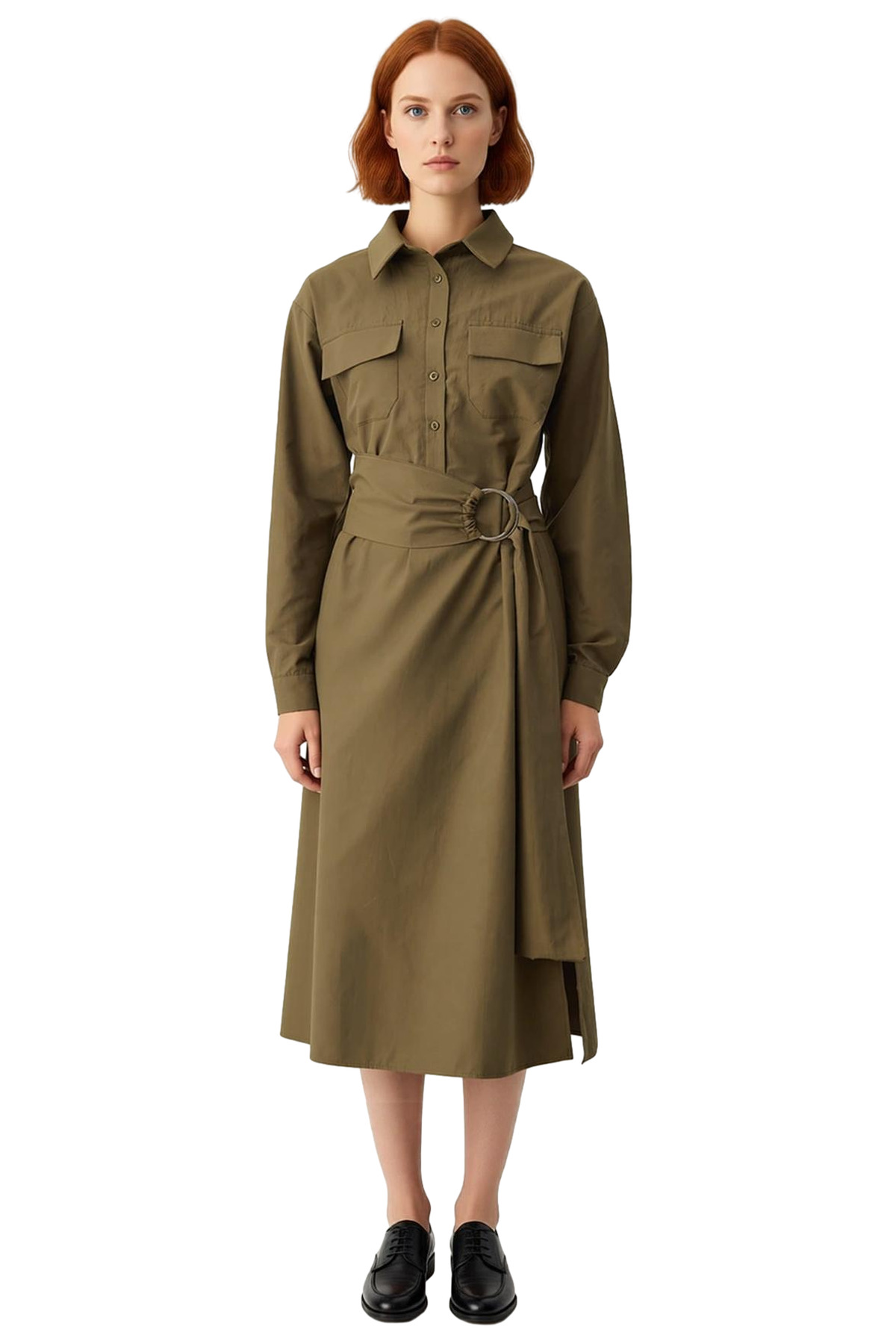 Ürün Özellikleri: A-line kalıp, 50% Pamuk 50% Polyester materyal, düz desen, gömlek yaka, standart kol, dokuma kumaş, haki renk.