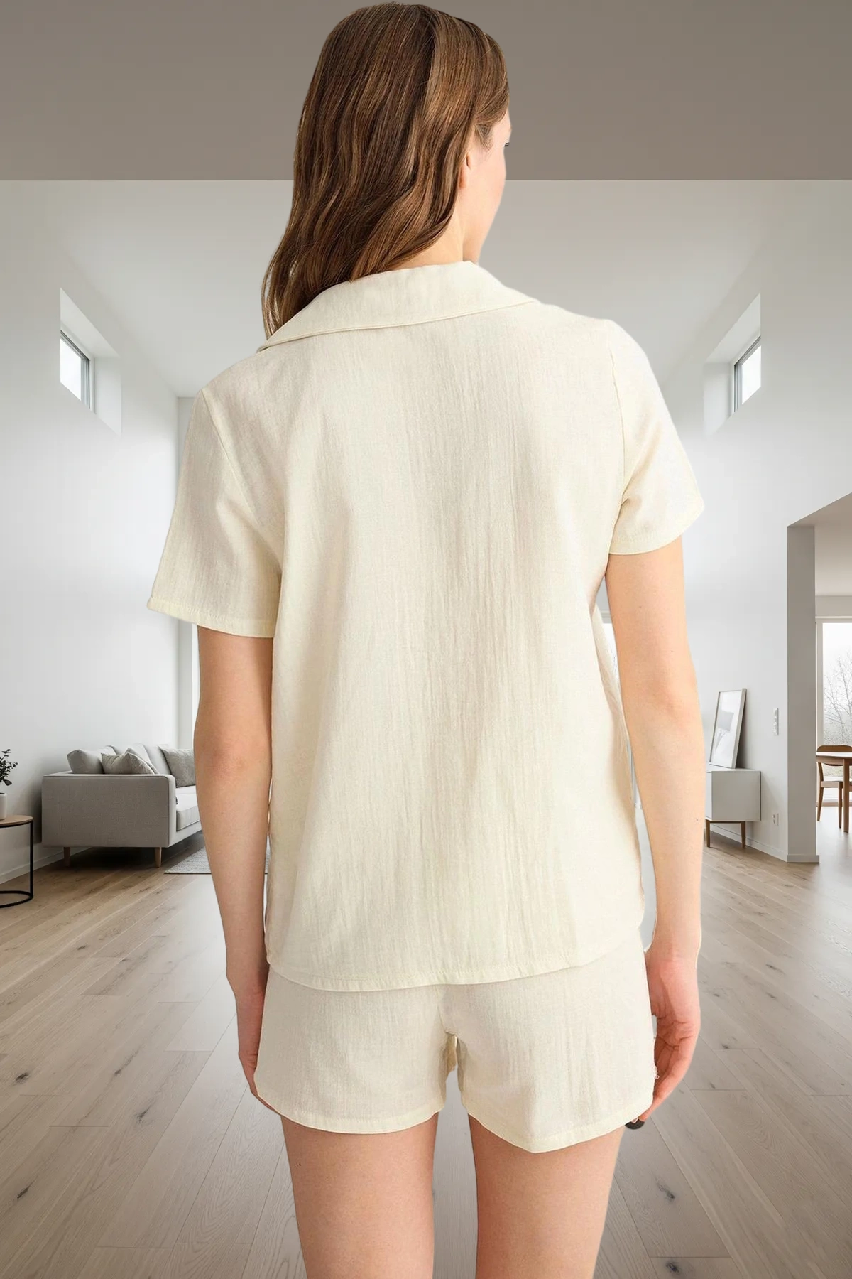 Bu zarif kadın pijama takımı, %100 pamuk müslin kumaşından üretilmiştir. Müslin dokusunun hafifliği ve nefes alabilirliği, gün boyu maksimum konfor sağlar. Düz lila rengi, üzerine işlenmiş narin papatya nakışlarıyla buluşarak takıma hoş bir estetik katıyor. Ürünün kalıbı regular fit olup, vücudu sıkmadan rahat bir oturuş sunar. Dokuma kumaş tipi, müslin dokusuyla birleşerek hem yumuşak hem de dayanıklı bir yapı oluşturur. Bu pijama takımı, evde rahatlığın ve şıklığın ön planda olduğu anlar için idealdir. Üst kısmındaki papatya nakışları, takıma sofistike bir dokunuş eklerken, genel tasarımı modern ve zarif bir görünüm sunar. Müslin kumaşın doğal yapısı, cilde dostu olmasıyla da bilinir, bu da onu hassas ciltler için bile uygun hale getirir. Bu ürün, ev giyim koleksiyonunuza hem konfor hem de stil katacaktır. Takımın üst kısmı, klasik bir gömlek yaka ve kısa kollu tasarıma sahiptir. Bu detaylar, hem şık bir görünüm sunar hem de kullanım kolaylığı sağlar. Regular fit kesimi, hareket serbestliğini kısıtlamadan rahat bir kullanım sunar. Şortun normal bel ve boru paça kesimi, rahat bir uyum ve hareket özgürlüğü sağlar. Müslin kumaşın hafifliği, bu pijama takımını özellikle sıcak hava koşulları için ideal kılar. Üzerindeki papatya nakışları, takıma feminen ve zarif bir hava katarak onu sıradan pijama takımlarından ayırır. Bu pijama takımı, evde dinlenirken bile stilinden ödün vermek istemeyen kadınlar için tasarlanmıştır. Konforu ve şıklığı bir arada sunan bu ürün, günlük ev giyimi için de mükemmel bir seçenektir. Bu pijama takımı, özellikle yaz ayları için ideal bir seçenektir. Hafif ve nefes alabilen müslin kumaşı, sıcak havalarda bile ferahlık hissi verir. Bu takımı, rahat bir ev terliği veya şık bir sandalet ile kombinleyerek ev içinde veya bahçede keyifli anlar yaşayabilirsiniz. Altına bol kesim bir şort veya rahat bir tayt ile de uyumlu bir görünüm elde edebilirsiniz. Şortlu alt kısmı, hareket özgürlüğü sunar. Bakımı oldukça pratiktir; düşük ısıda yıkanması ve doğal olarak kurumaya bırakılması tavsiye edilir. Bu şekilde müslin kumaşın eşsiz dokusu ve yumuşaklığı uzun yıllar korunur.