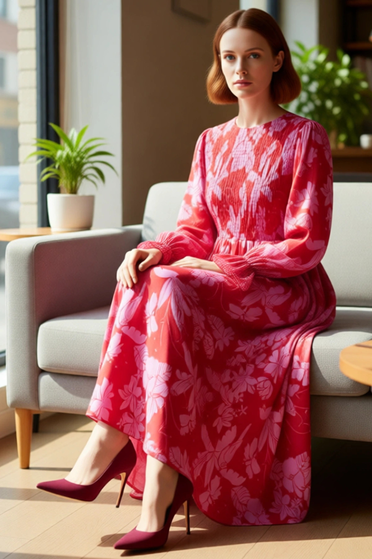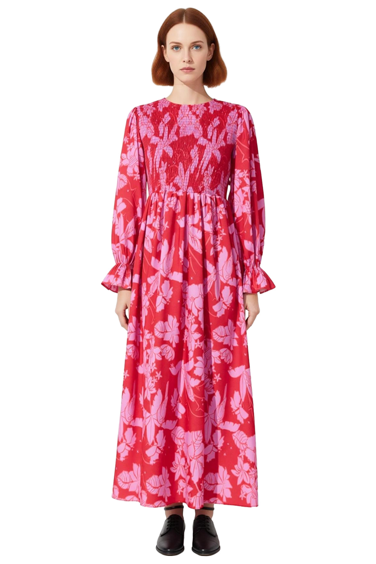 Ürün Özellikleri: A-line kalıp, polyester karışımlı materyal, çiçekli desen, bisiklet yaka, uzun büzgülü/fırfırlı kol, dokuma kumaş, kırmızı renk.