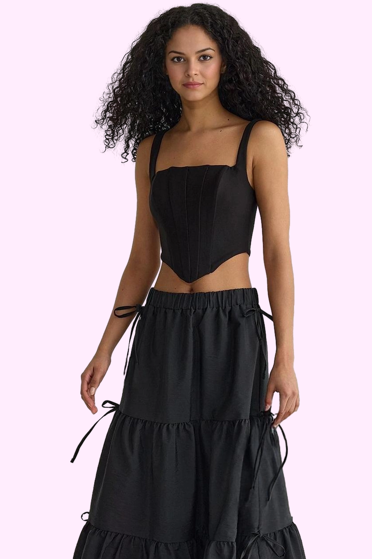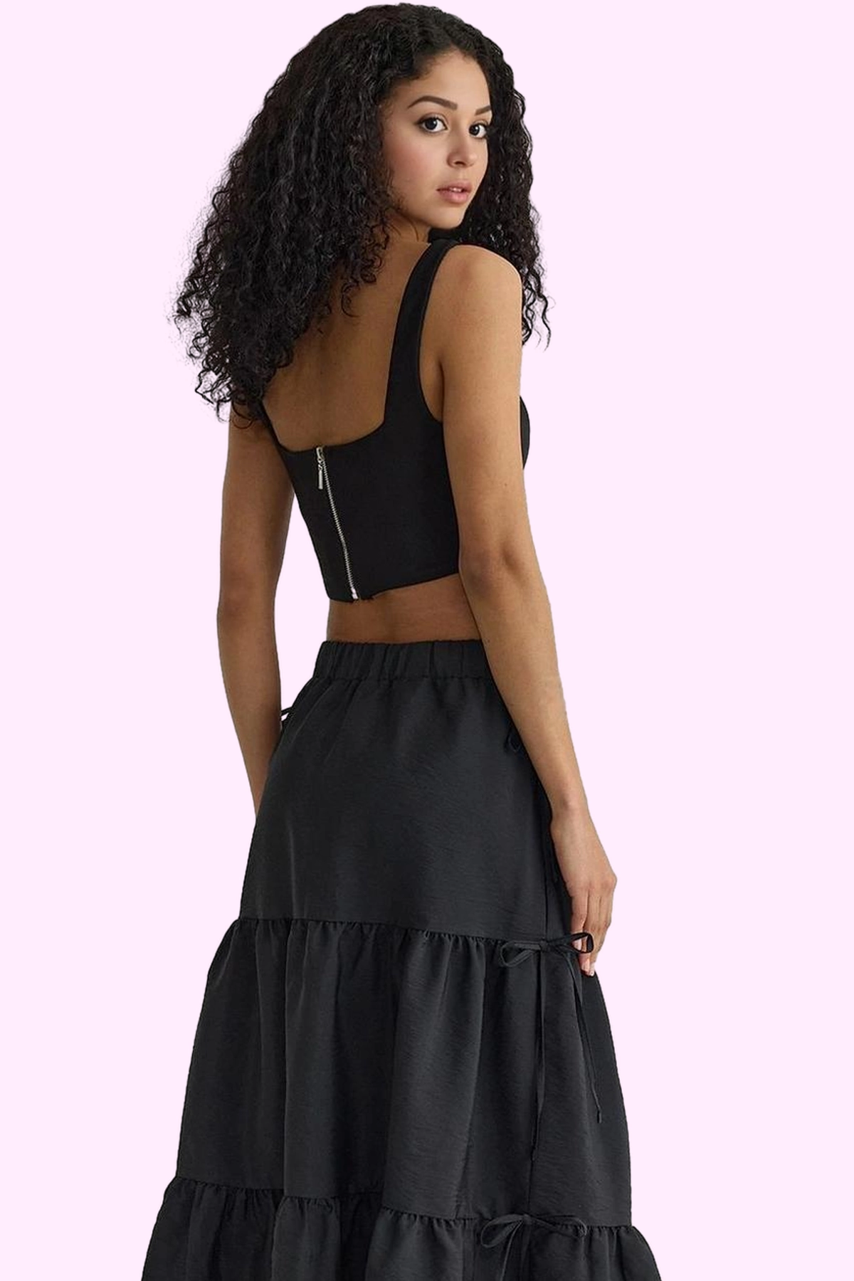 Yaz aylarının şıklığına ve rahatlığına kavuşun! Bu göz alıcı siyah maxi etek, A-line kesimi ve paraşüt dokuma kumaşı ile benzersiz bir stil sunuyor. Hem günlük yaşamınızda hem de özel günlerinizde rahatlıkla kullanabileceğiniz bu etek, her türlü kombinle uyum sağlayacak şekilde tasarlanmıştır. Zarif ve modern tasarımı, her kadının gardırobunda olması gereken bir parça. Kurdele detayları ise eteğe özgün bir hava katıyor.