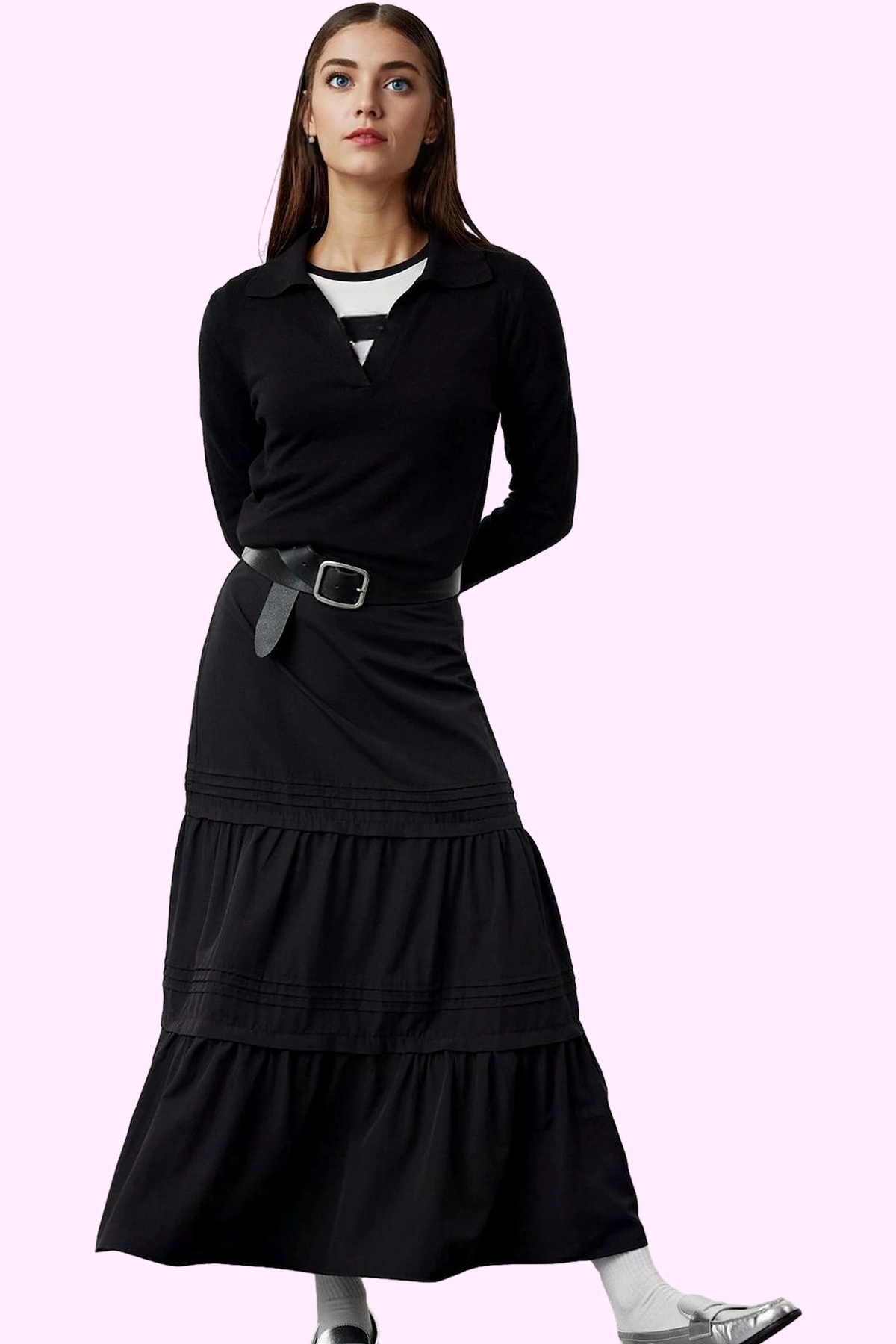 Şıklığı ve rahatlığı bir arada sunan bu siyah maxi eteğimiz, gardırobunuzun yeni favorisi olacak! Ramadan koleksiyonumuzdan özel seçilmiş bu etek, poplin kumaşından üretilmiş olup, hem günlük hem de özel günlerinizde rahatlıkla kullanabileceğiniz bir parça. Eteğin fırfırlı eteği ve skater kalıbıyla modern ve feminen bir görünüm elde edebilirsiniz. Kemer detayıyla belinizi ince gösteren etek, aynı zamanda rahat bir kullanım sunuyor. Cepsiz tasarımıyla minimalist bir şıklık sağlayan bu etek, farklı üstlerle kolayca kombinlenebiliyor.
