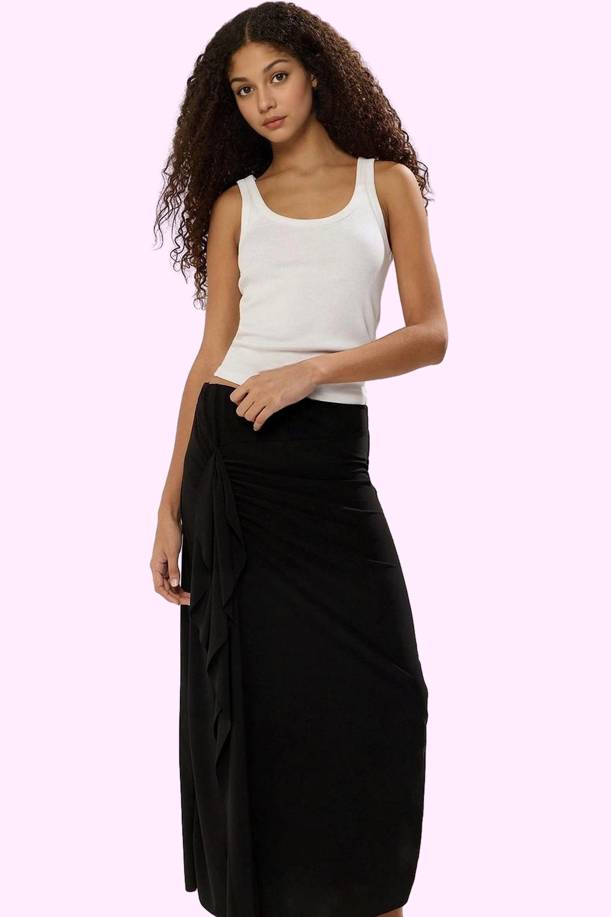 Günlük şıklığınıza feminen bir dokunuş katacak bu siyah maxi etek, benzersiz tasarımıyla dikkat çekiyor. Yüksek bel kesimi ve vücuda oturan kalıp, silüetinize mükemmel bir uyum sağlayarak sizi olduğunuzdan daha uzun ve ince gösterecek. Nefes alan örme kumaş yapısıyla gün boyu konfor sunarken, asimetrik ve kalem kalıp detayları, modern ve şık bir görünüm yaratıyor. Fırfırlı detaylar ise eteğe hareketlilik ve özgünlük katıyor.