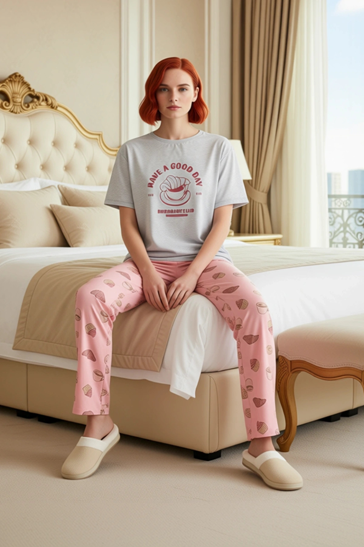 Kadın Melanj Slogan Baskılı Ev Giyim Takımı Fonksiyonel Dayanıklı Kaliteli Konforlu Modern
