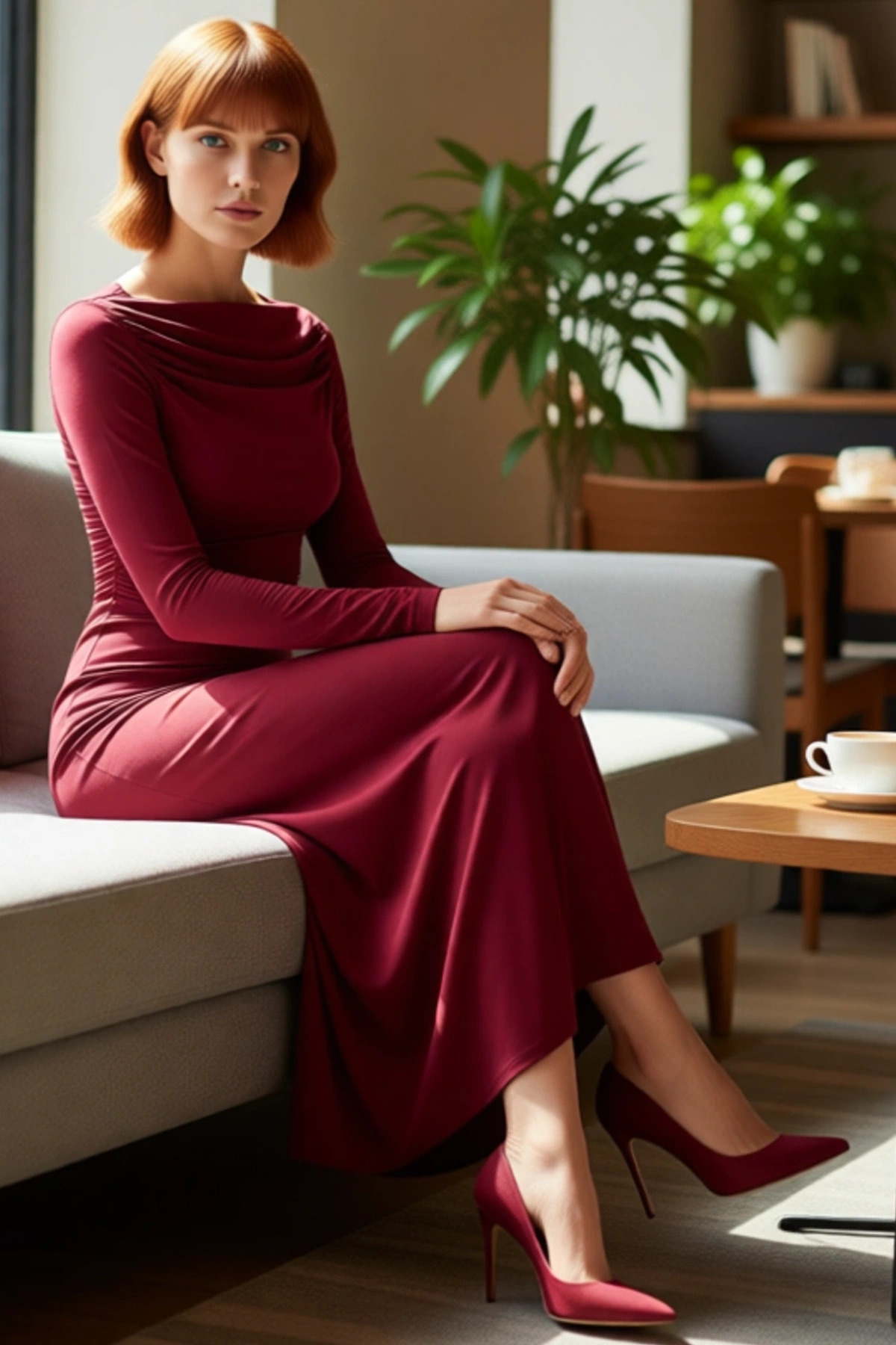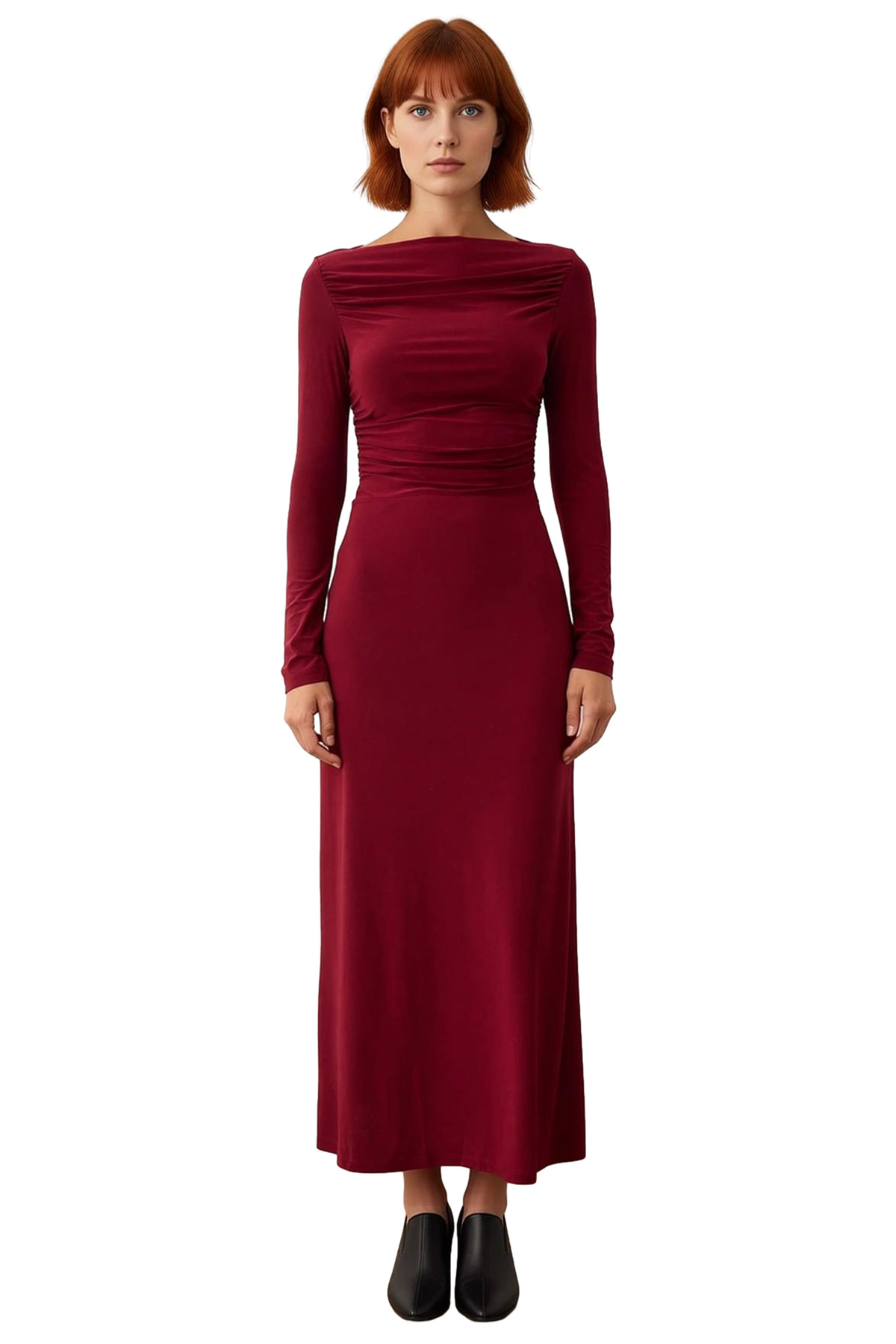 Ürün Özellikleri: Bodycon kalıp, polyester elastan materyal, düz desen, kayık yaka, standart kol, örme kumaş, bordo renk, büzgülü tasarım.