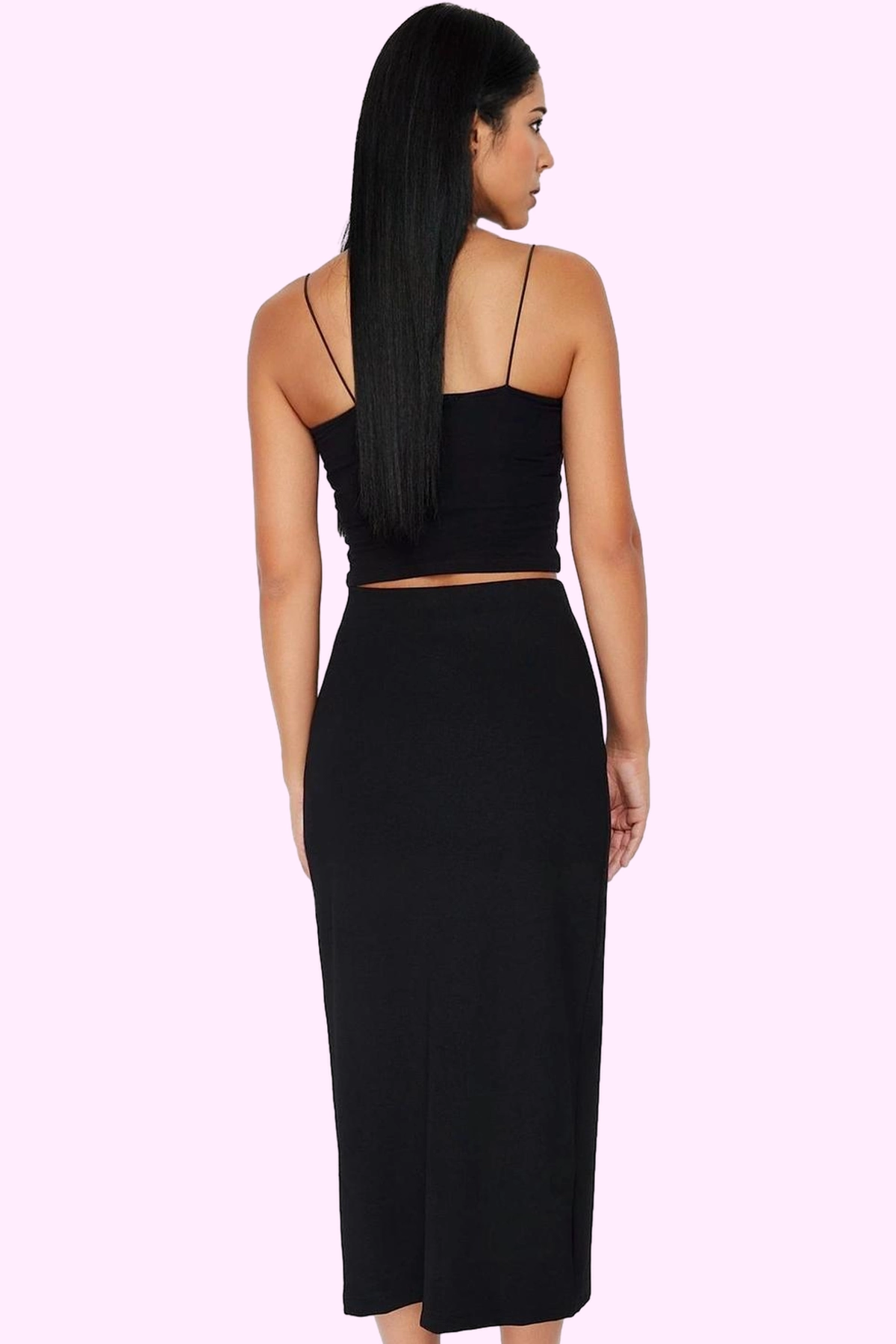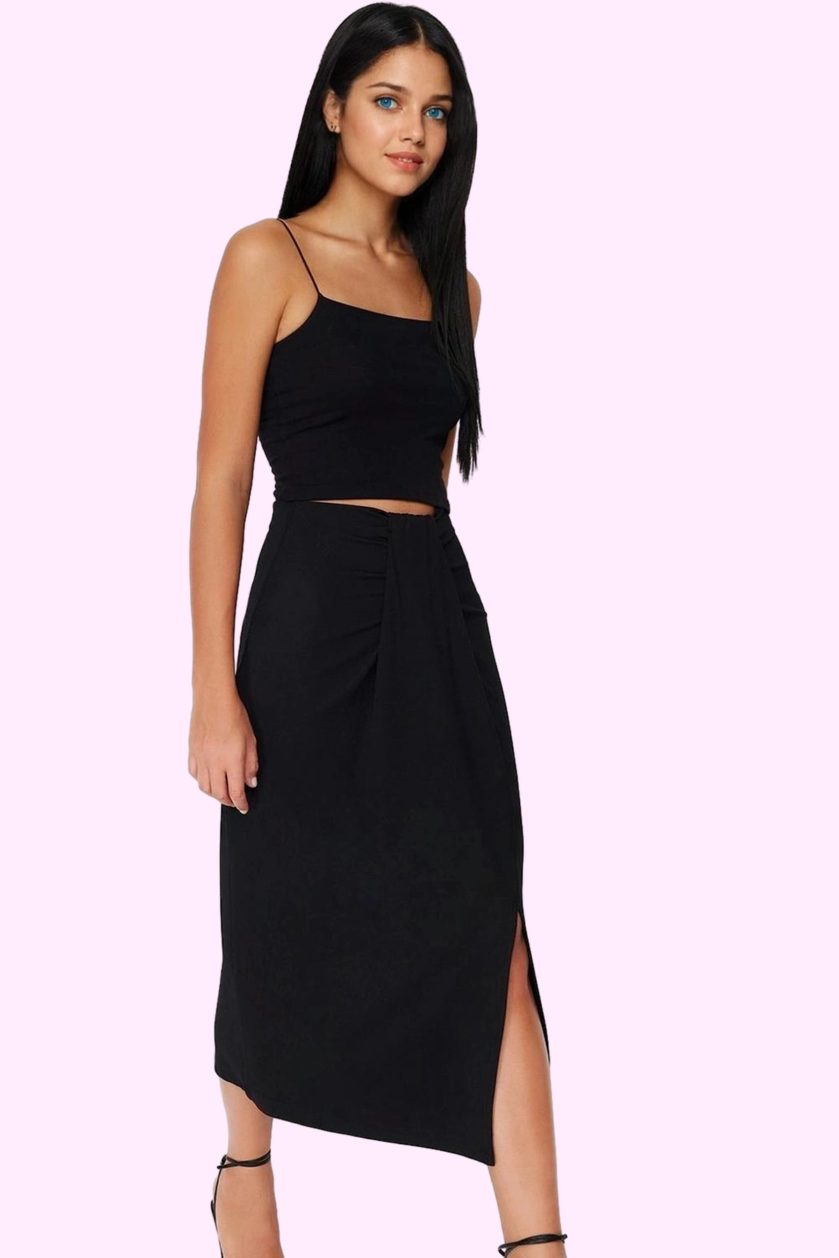 İş hayatında şıklığı ve rahatlığı bir arada arayan kadınlar için ideal bir seçim olan bu siyah midi etek, anvelop ve kruvaze tarzıyla dikkat çeken bir tasarıma sahip. Kalem kalıbıyla vücut hatlarınızı zarifçe vurgulayan etek, örme kumaş yapısı sayesinde gün boyu konfor sunuyor. Düz deseni ve cepsiz tasarımıyla şık ve minimalist bir görünüm sergilerken, astarsız yapısıyla yaz aylarında bile serin kalmanıza yardımcı oluyor. Normal bel yüksekliği ve kemersiz tasarımıyla hareket özgürlüğünüzü kısıtlamıyor. Makinede kolayca yıkanabilen kumaşıyla pratik kullanım sağlıyor.
