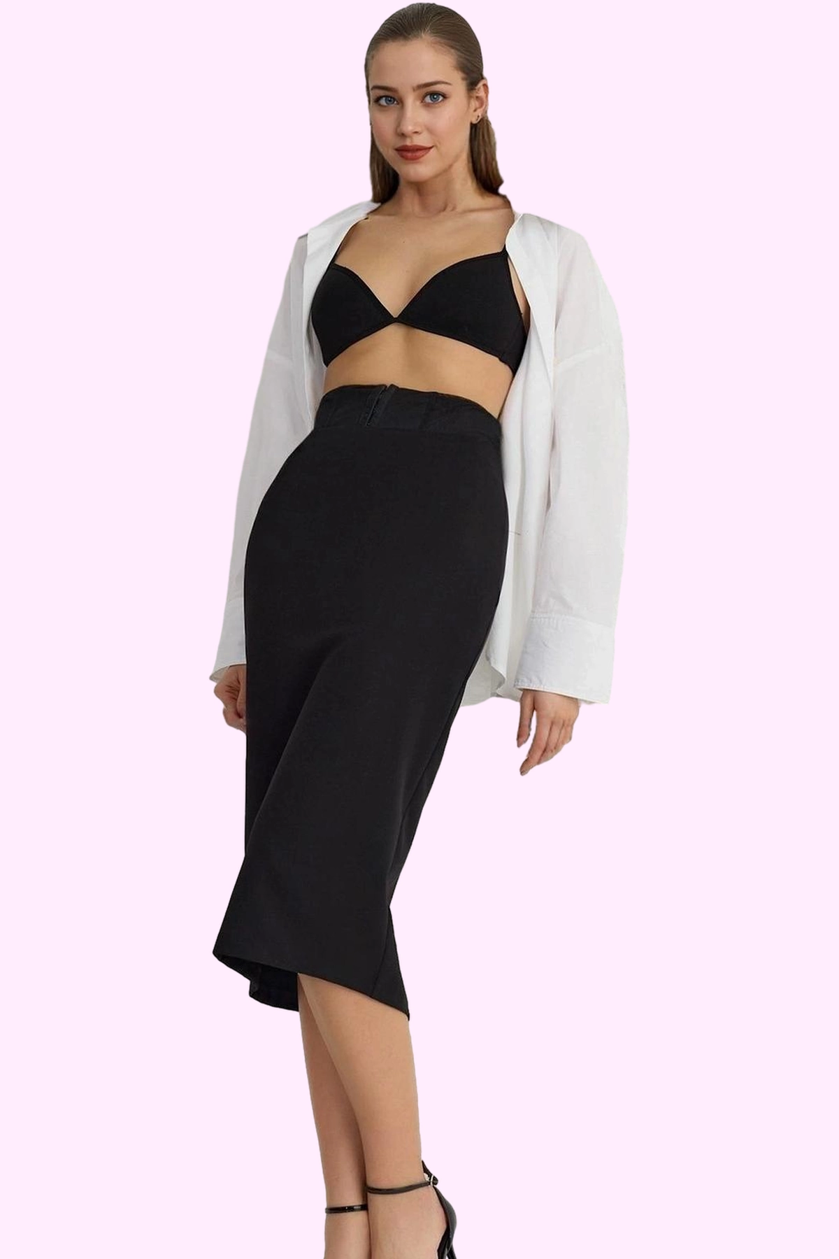 Bu sezonun en göz alıcı parçası, siyah midi kalem eteğimiz ile tanışın! Yüksek bel tasarımı ve kusursuz kalıbıyla vücudunuzu sararak feminen bir silüet oluşturur. Korseli detayı, eteğe modern ve şık bir dokunuş katarken, düz desen seçeneğiyle her türlü üst ile kombinlenebilir. Dokuma kumaş yapısı, nefes alabilirliği ve konforu bir arada sunarak tüm gün rahat etmenizi sağlar. Astarsız yapısıyla yaz aylarında serin kalmanızı garantilerken, özel davetlerde de göz alıcı bir görünüm sergileyebilirsiniz.