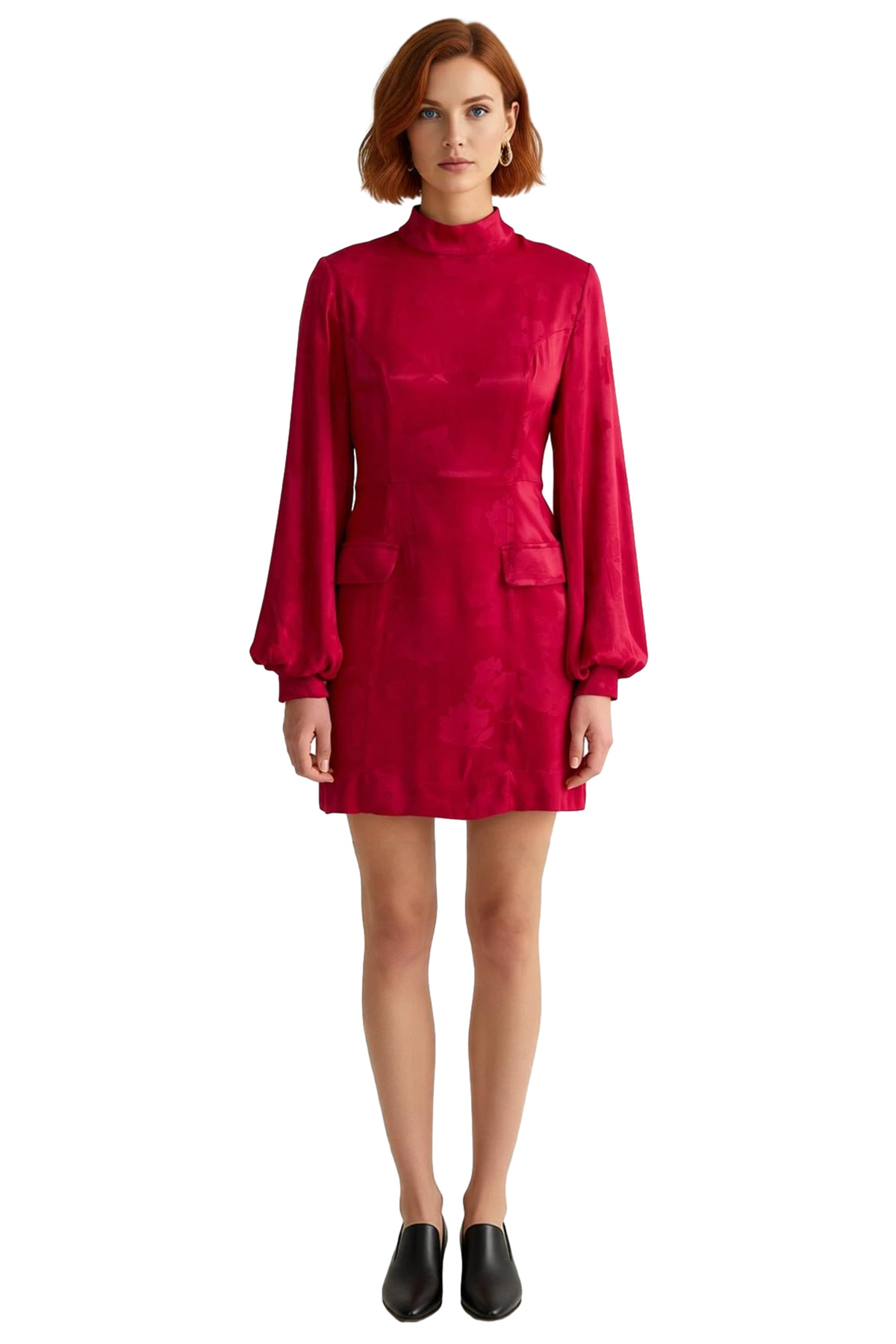 Ürün Özellikleri: A-line kalıp, dokuma materyal, jakar desen, dik yaka, balon kol, dokuma kumaş, bordo renk, baskısız tasarım.