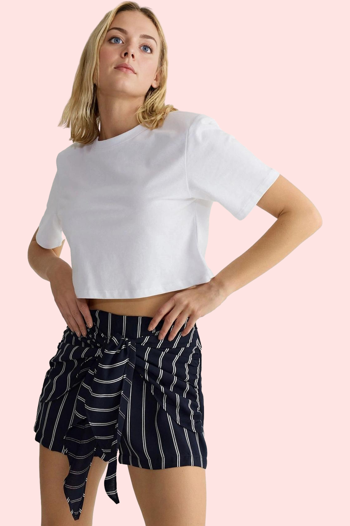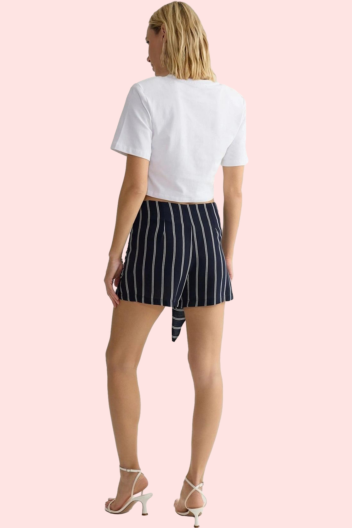 Dokuma kumaşı sayesinde oldukça dayanıklı ve uzun ömürlüdür. Yüksek bel tasarımıyla vücudunuzu saran şort, kusurları gizler ve sizi olduğunuzdan daha uzun gösterir. Bağlamalı detayı, şorta özgün ve dikkat çekici bir tarz kazandırır. Kemersiz tasarımı pratik kullanım sağlar ve kombinlerinizi daha da kolaylaştırır.