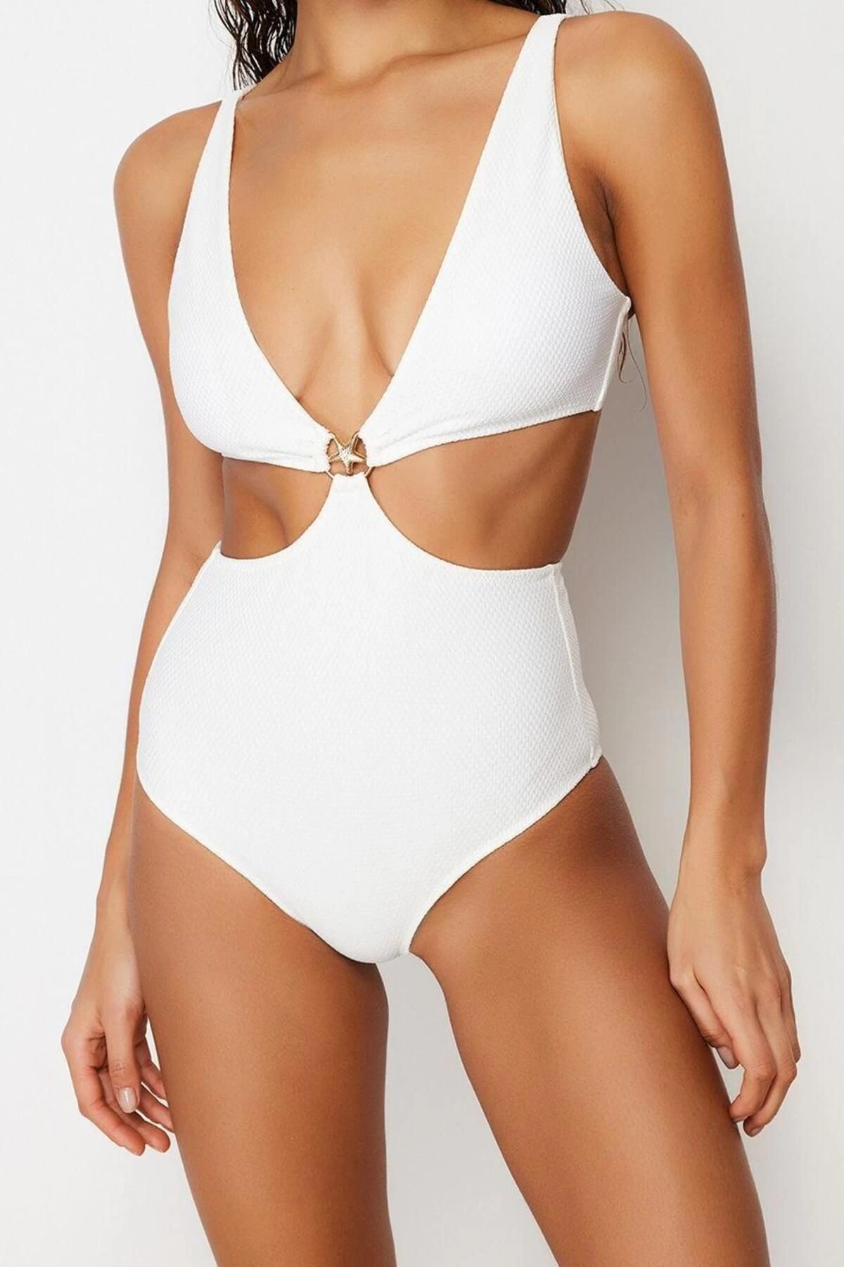 Kadın Moda Atma Kap Askılı Derin V Yaka Ekru Premium Aksesuarlı Regular Mayokini