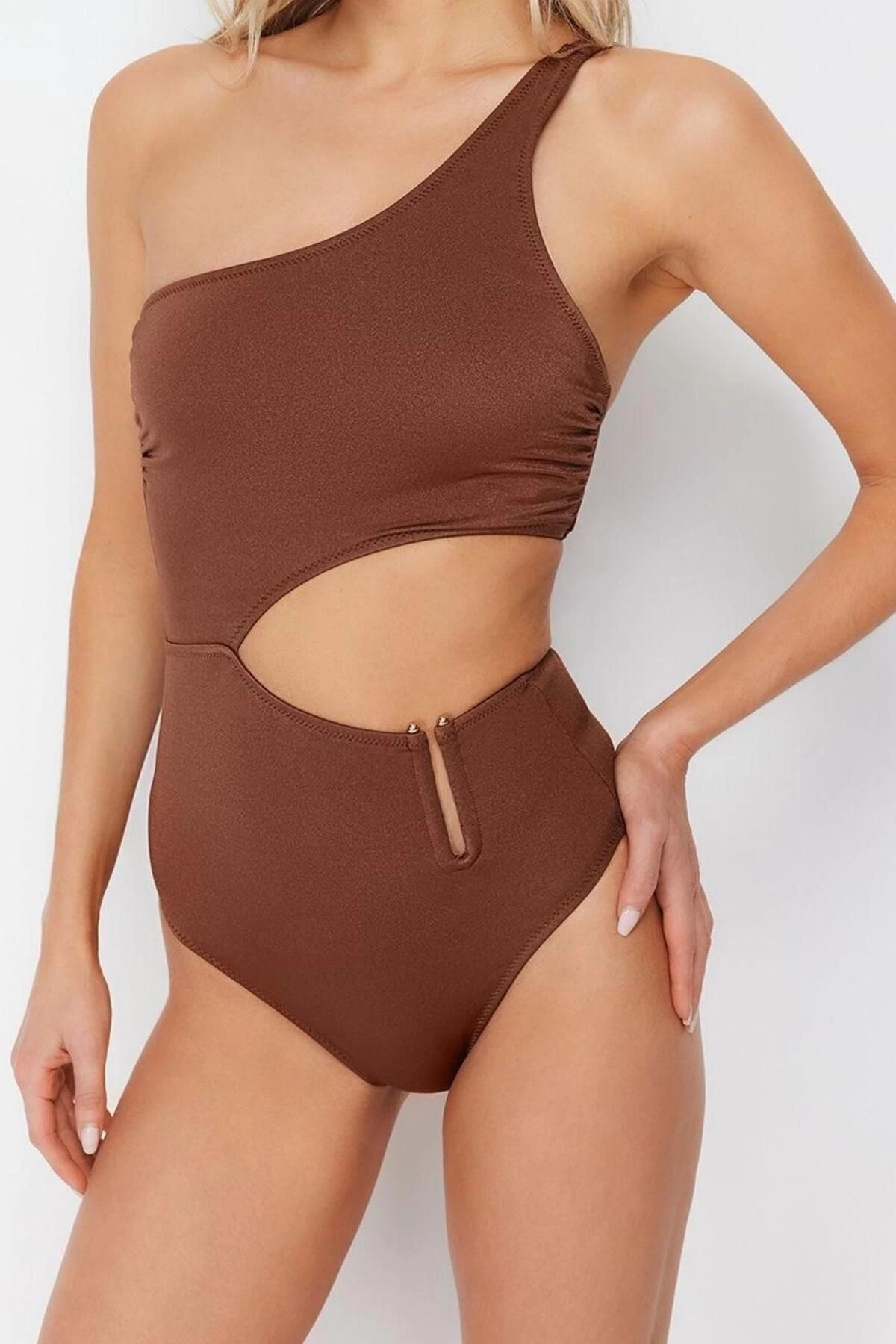 Kadın Moda Atma Kap Omzu Açık Carmen Yaka Kahverengi Tek Omuz Aksesuarlı Regular Mayokini