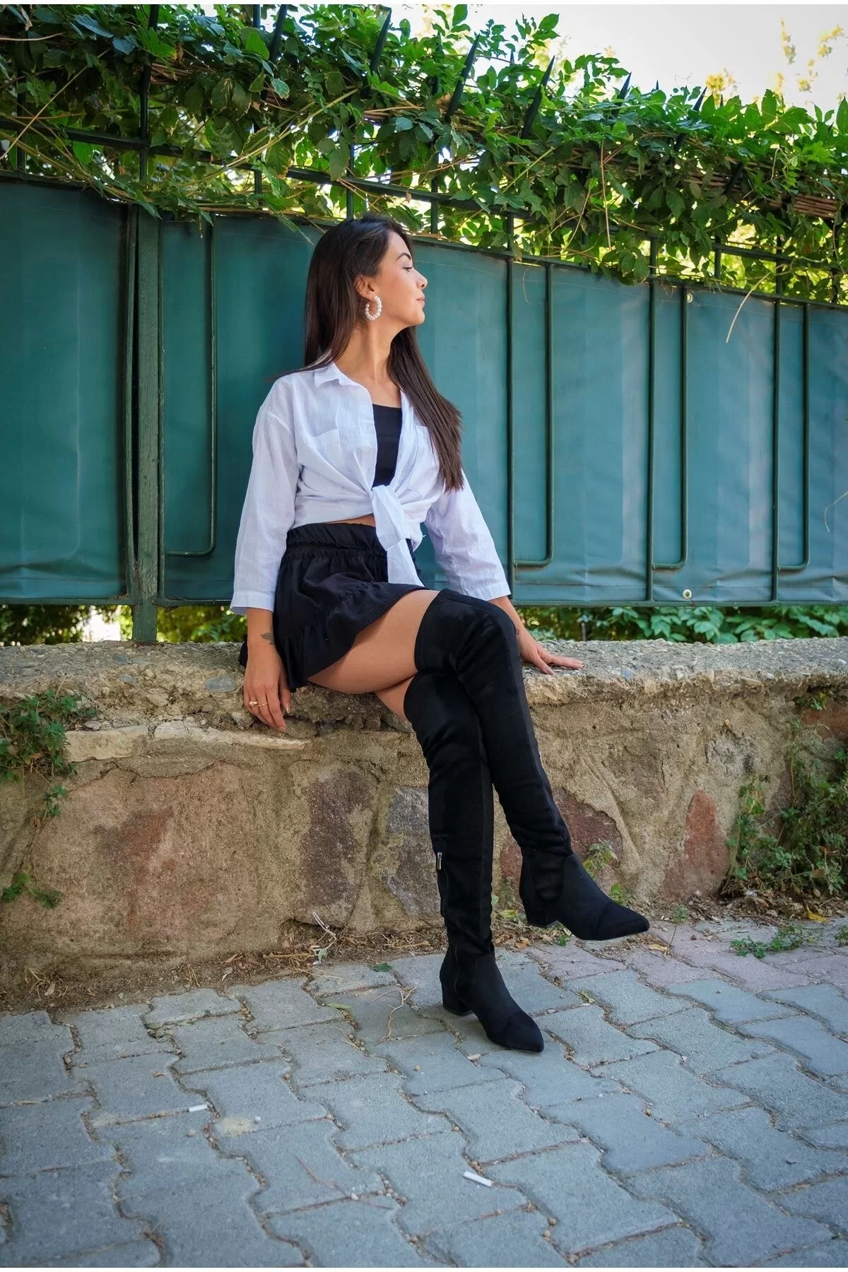 Kadın Kısa Topuklu Diz Üstü Streç Çizme, stil sahibi kadınların dolabında mutlaka bulunması gereken, zarif detaylarla tasarlanmış bir modeldir. Topuk Boyu: 3,5 cm sayesinde hem günlük kullanıma hem de özel davetlere uygun rahat bir deneyim sunar. Modern çizgileri ve kaliteli yapısıyla hem şıklığı hem de konforu bir arada yaşamanızı sağlar.