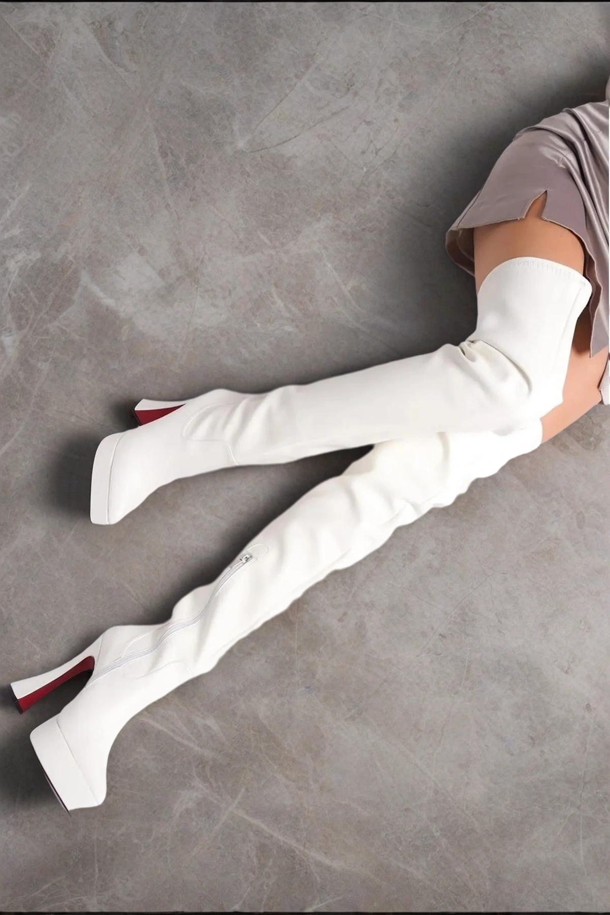 Kadın Moda Çift Platform Yüksek Topuklu Diz Üstü Streç Çizme Şık ve Zarif Abiye Ayakkabı
