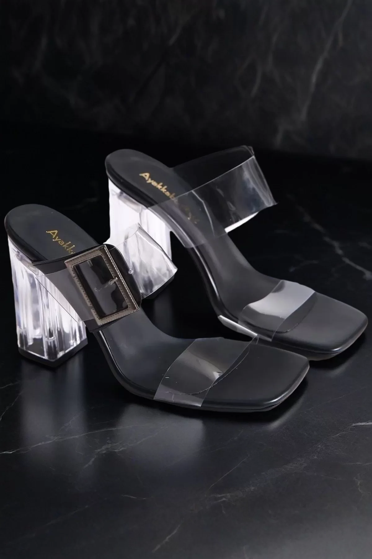 Kadın Moda Siyah Cilt Tokalı Şeffaf Topuklu Terlik Şık ve Zarif Abiye Ayakkabı