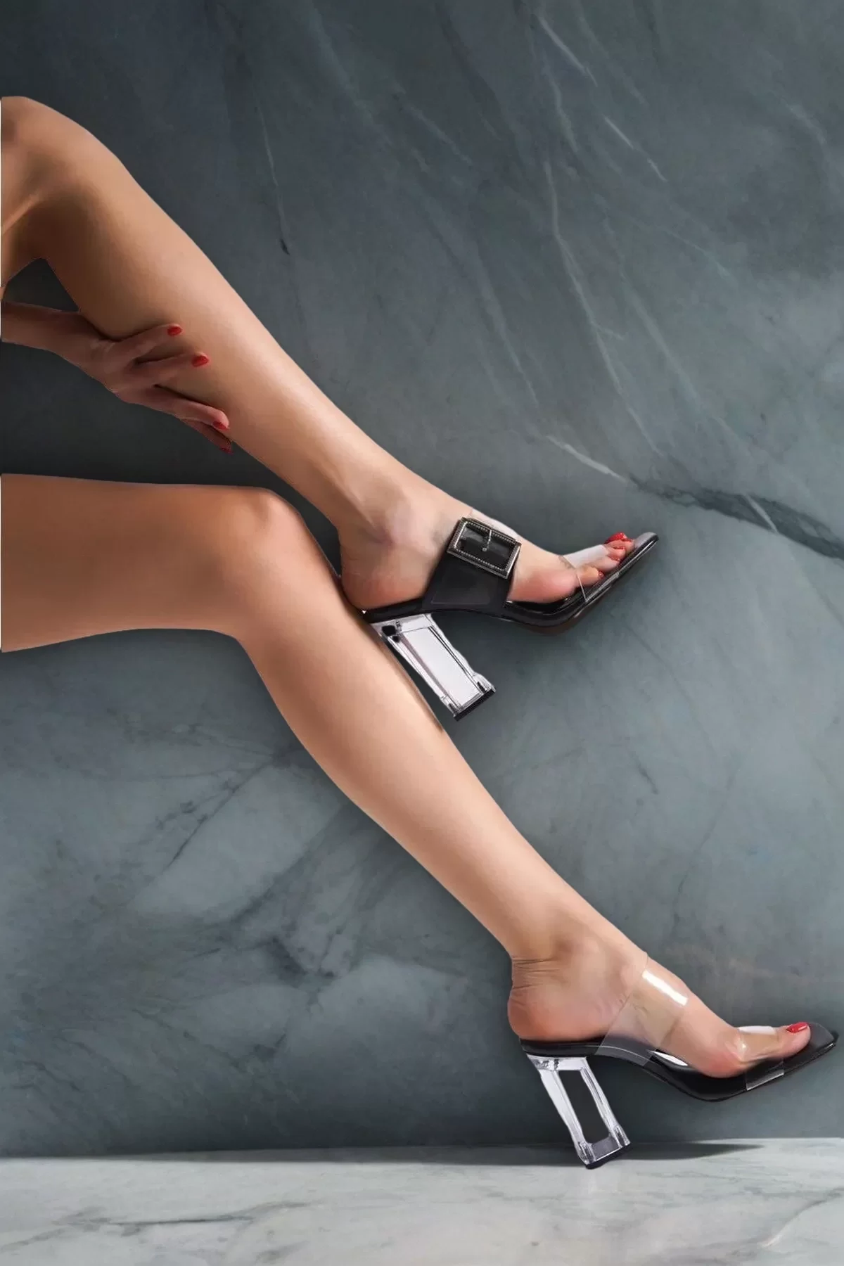 Kadın Moda Siyah Cilt Tokalı Şeffaf Topuklu Terlik Şık ve Zarif Abiye Ayakkabı - Görsel 4