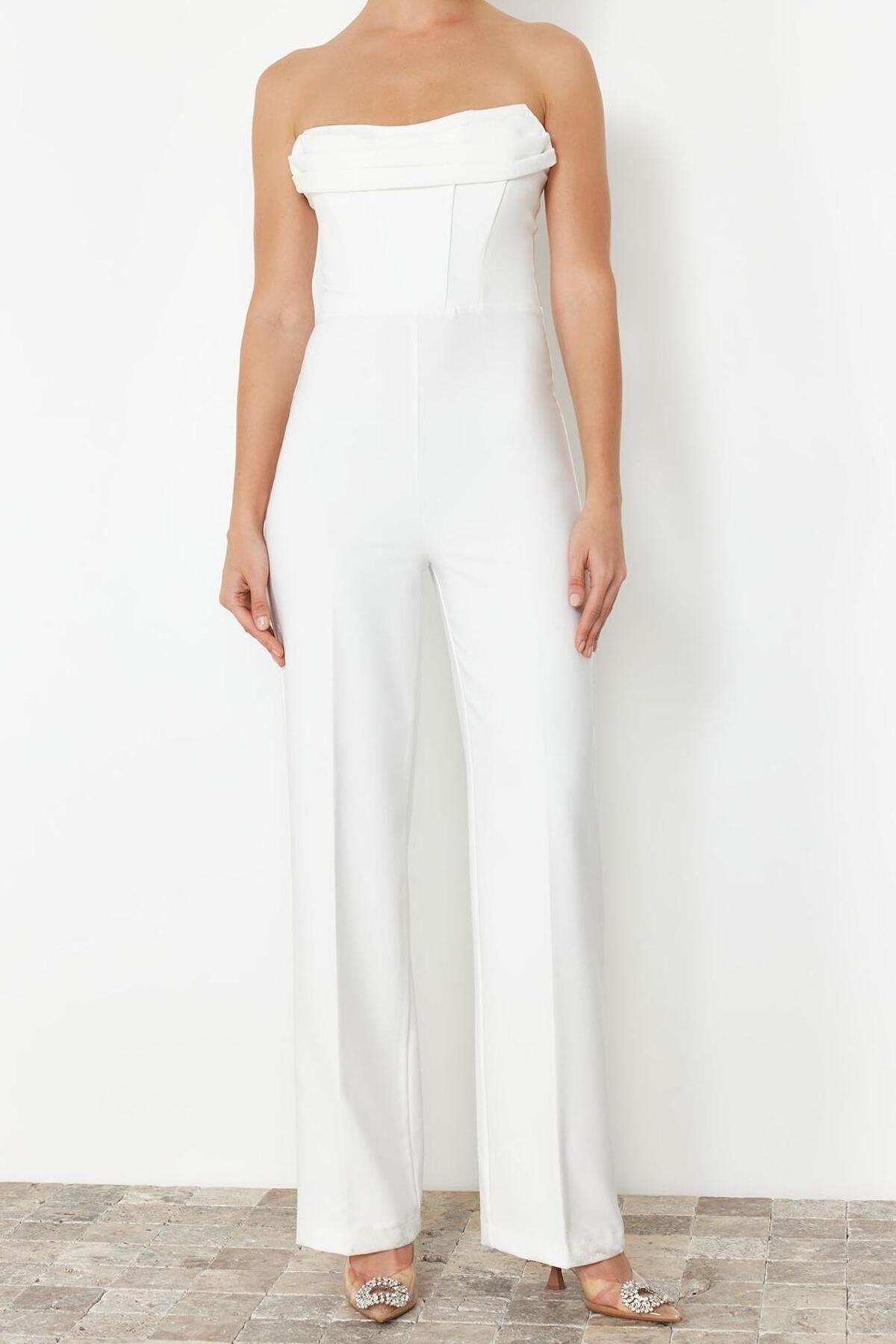 Kadın Moda Standart Kol Geniş Paça Kruvaze Düz Desen Kısa Kemerli Kurvaze Yaka Mini Dokuma Tulum
