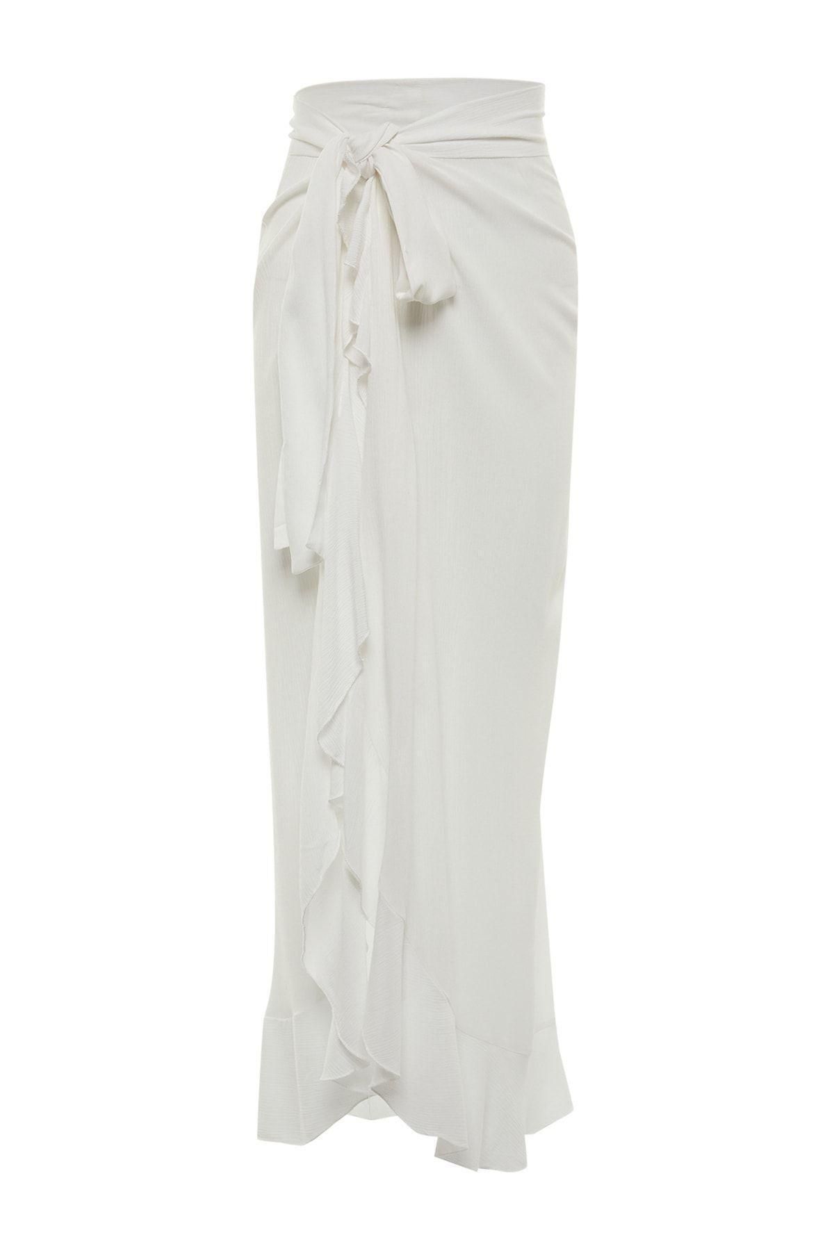 Moda Kruvaze Düz Desen Plaj Midi Boy Maxi Dokuma Volanlı Etek