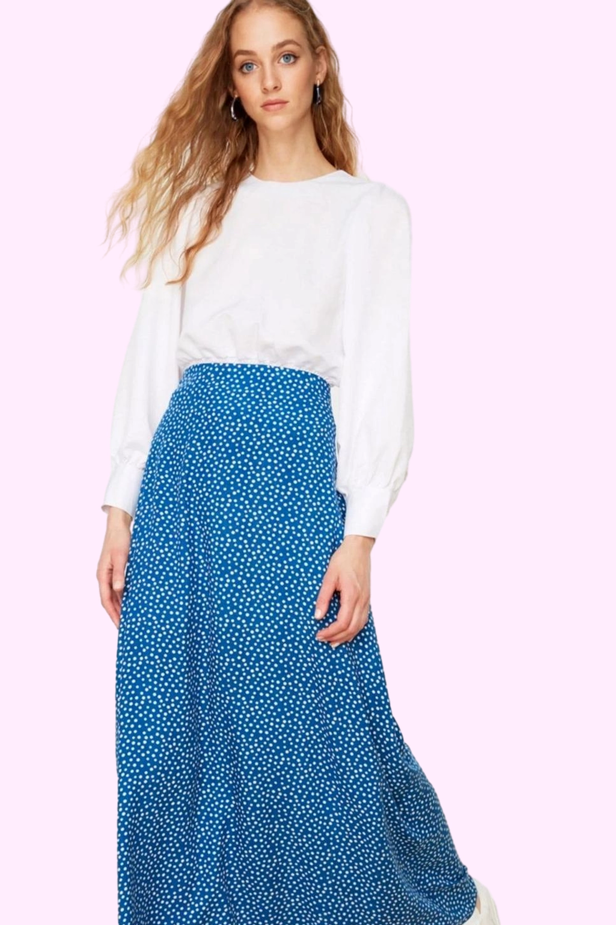 Moda Tesettür Regular Çiçekli Desen Günlük Maxi Boy Puantiye Desenli Çan Dokuma Etek