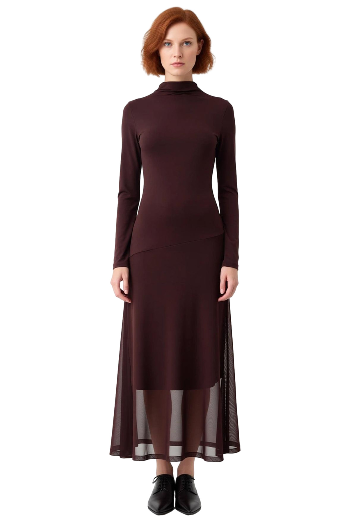 Ürün Özellikleri: A-line kalıp, %96 polyester %4 elastan materyal, düz desen, dik yaka, standart kol, örme kumaş, kahverengi renk, tül garni detaylı, astarlı tasarım.
