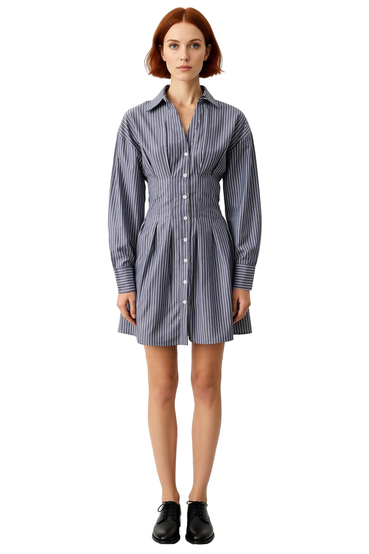 Kadın Modern Düşük Kol Uzun Kollu Çizgili Dokuma Mini Gömlek Elbise Rahat Yaka Stili