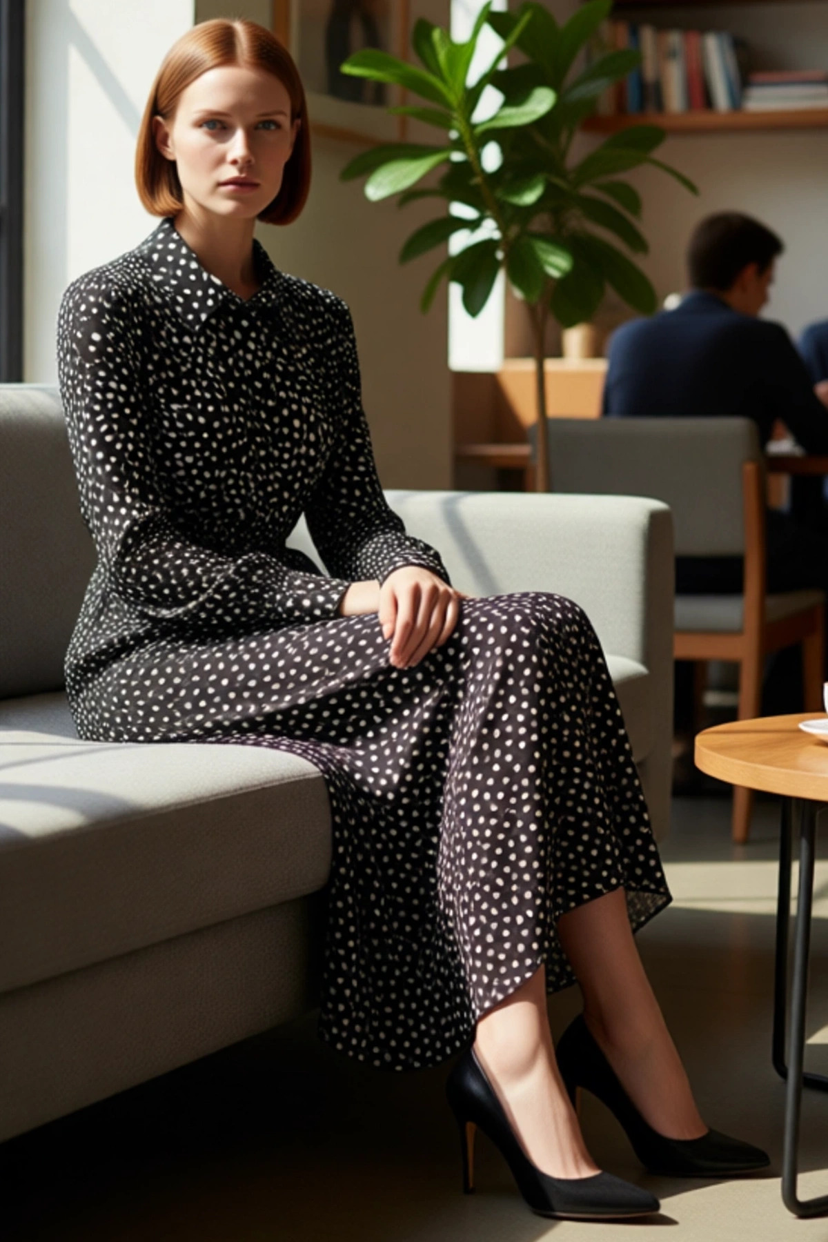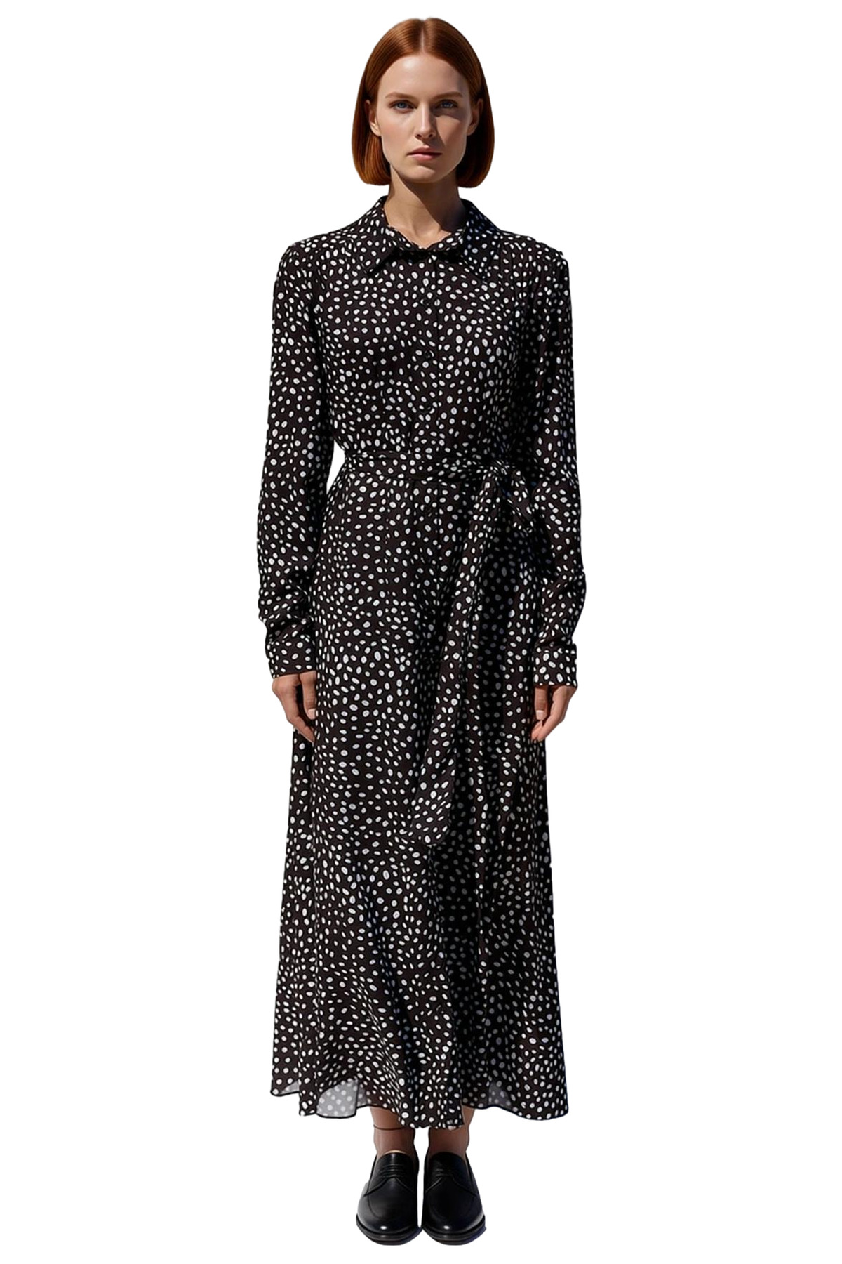 Ürün Özellikleri: Skater kalıp, 100% viskoz materyal, puantiyeli desen, gömlek yaka, balon kol, dokuma kumaş, koyu kahverengi, astarsız tasarım.