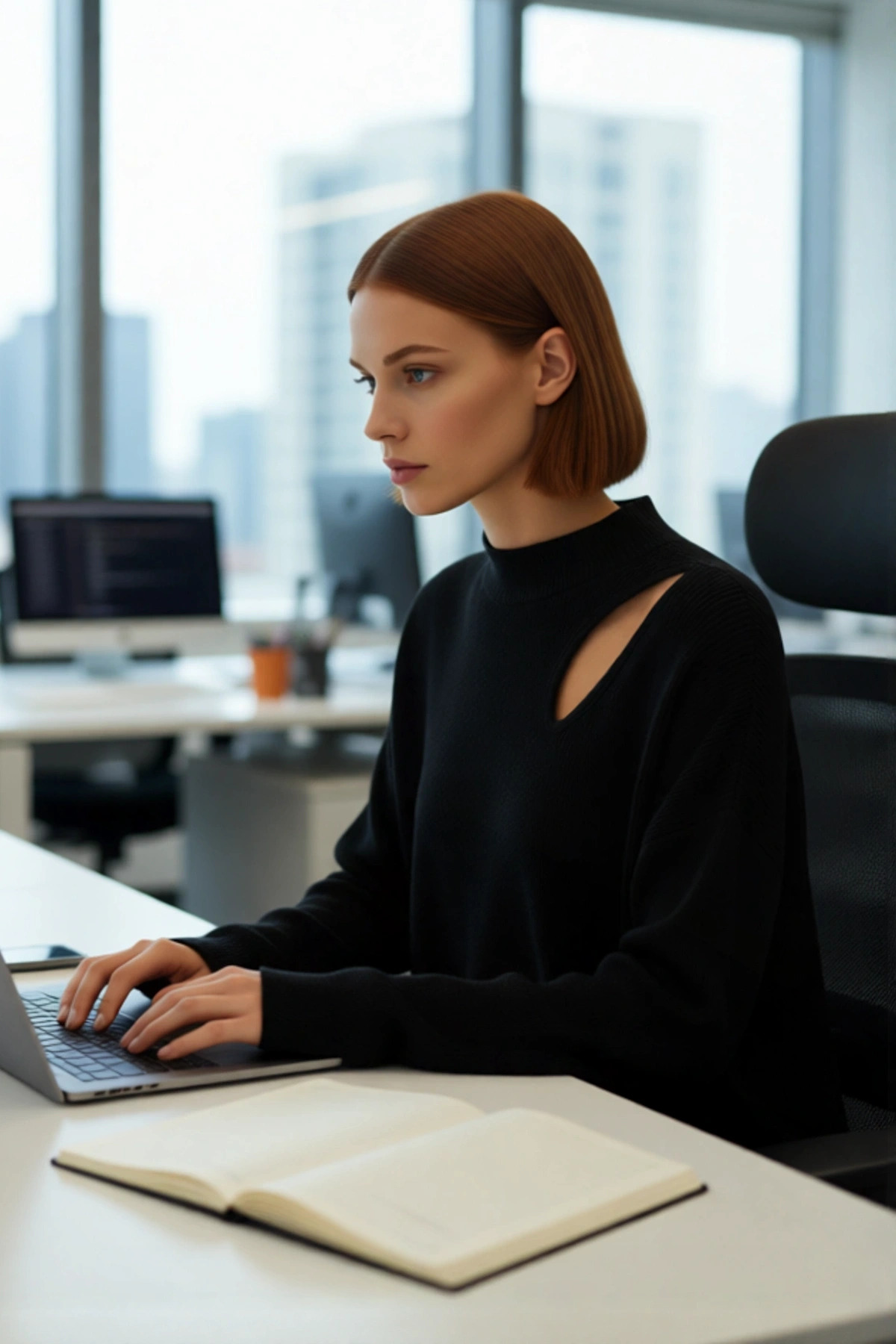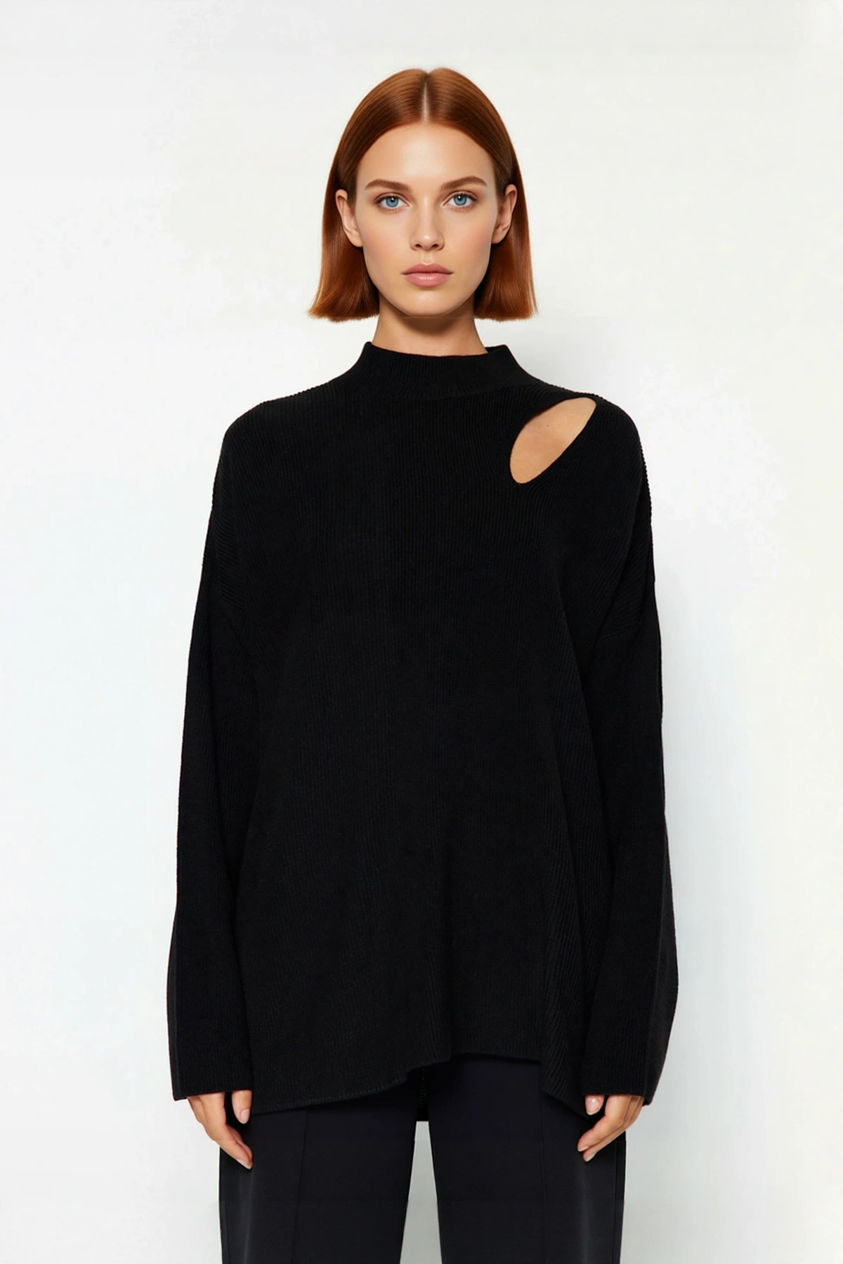 Kadın Modern Oversize Düşük Kol Siyah Akrilik Triko Kazak Cut Out Detaylı Günlük Şıklık Kaliteli