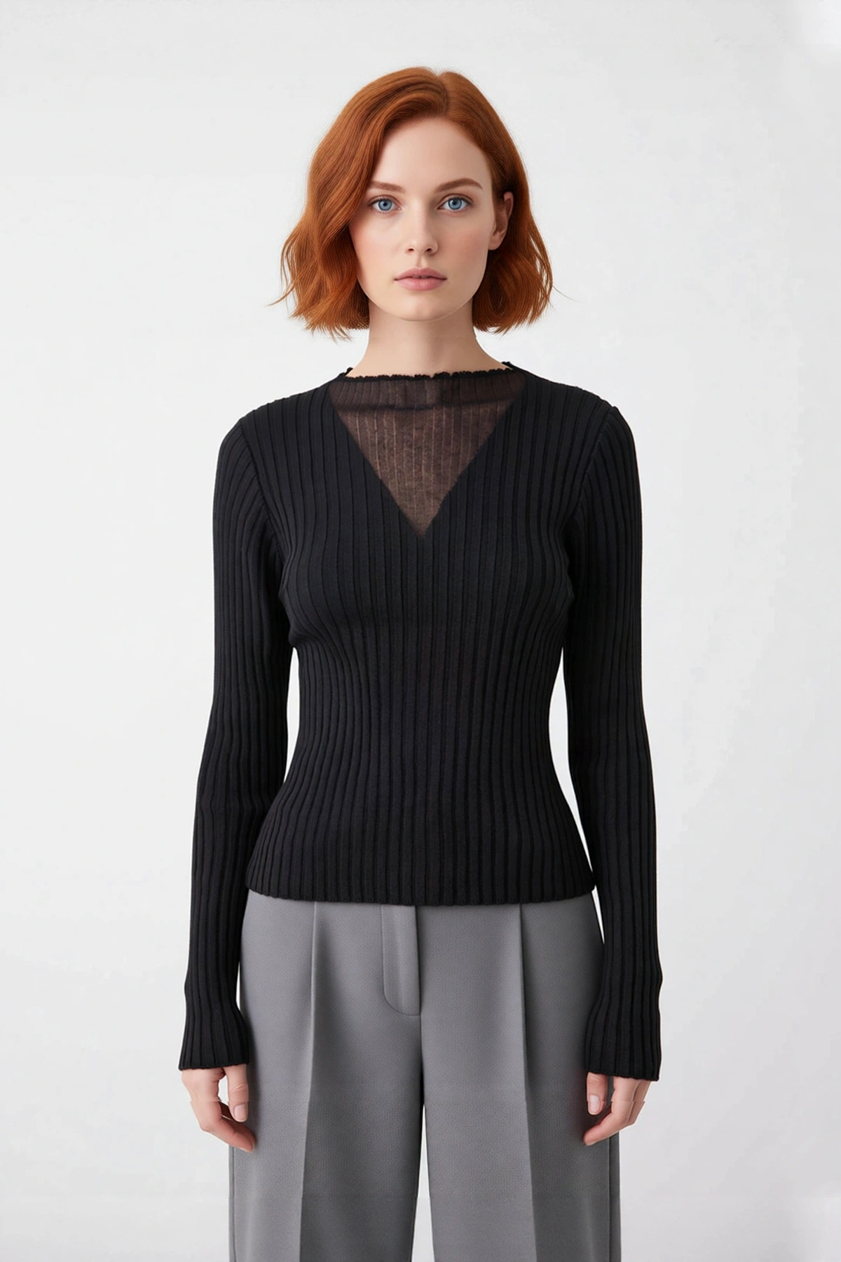 Özgün ve modern bir stil arayan kadınlar için tasarlanan bu siyah fitted triko kazak, vücuda oturan kalıbıyla çağdaş bir zarafet sunar. %100 akrilik materyalden üretilmiş olması sayesinde hem hafif hem de cilde nazik bir dokunuş sağlar, gün boyu konfor vadeden ideal bir seçenektir. Düz ve sade tasarımı, transparan V yaka detayıyla hareketlenerek ürüne sofistike bir derinlik katar. Klasik siyah rengi ise her türlü kombinle uyum sağlayarak gardırobunuzun temel parçalarından biri olmaya adaydır. Bu kazakla her ortamda dikkat çekici bir şıklık yakalayın.