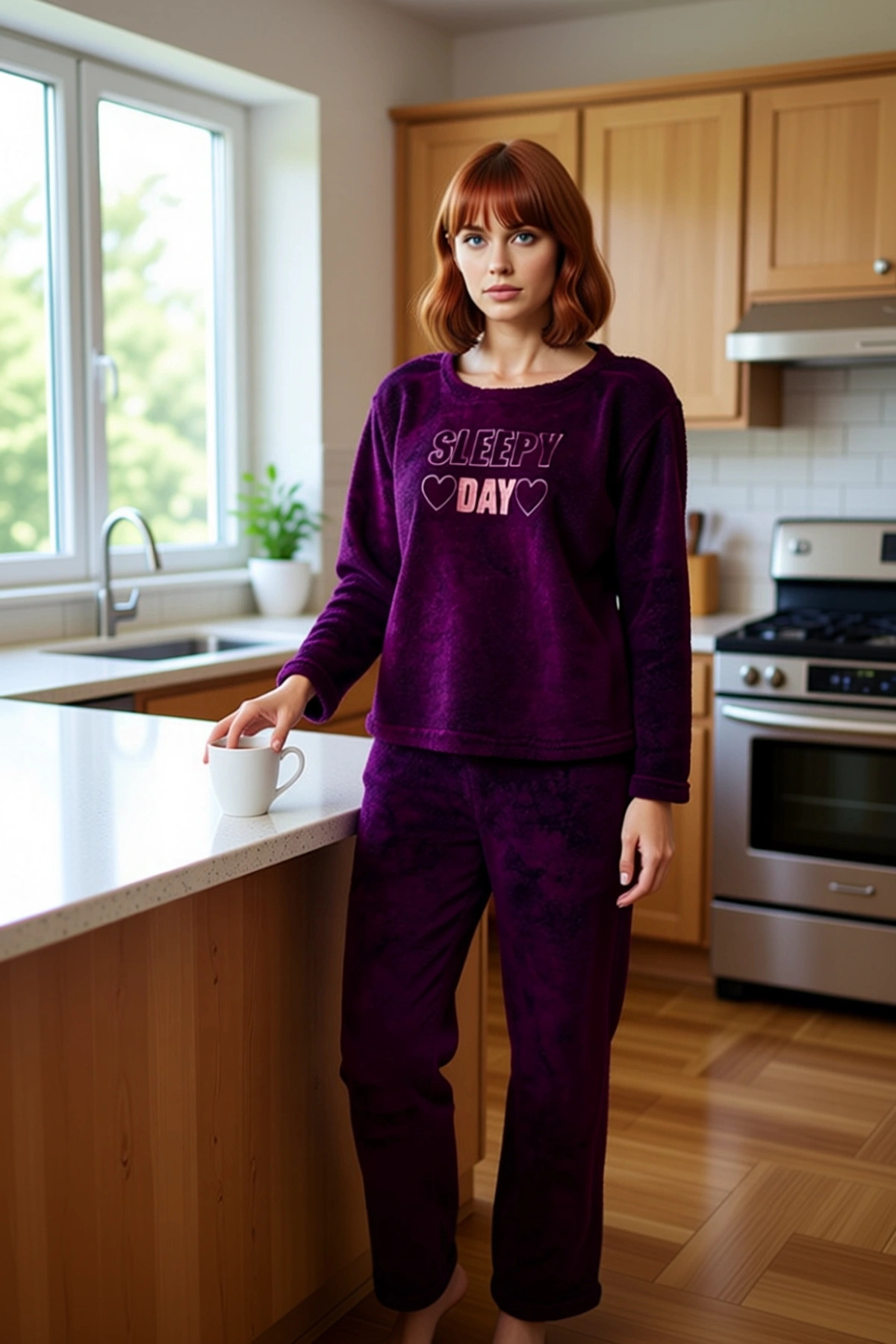 Bu kadın pijama takımı, evde geçirdiğiniz vakitleri daha konforlu ve stil sahibi kılmak için tasarlandı. Alt-üst takım olarak sunulan ürün, bir sweatshirt ve bir pantolondan oluşuyor. Regular kalıbı sayesinde vücuda nazikçe otururken, hareket özgürlüğünüzü kısıtlamaz. Materyal olarak %100 polyester wellsoft kullanılmıştır. Bu özel kumaş, olağanüstü bir yumuşaklık ve sıcaklık sunarak kış aylarında sizi sarıp sarmalar. Üzerindeki ‘Sleepy Day’ sloganı ve sevimli kalp figürleri, takıma neşeli bir dokunuş katıyor. Düz mürdüm rengi, zarif nakış detaylarıyla tamamlanarak sofistike bir görünüm sergiliyor. Homewear koleksiyonunun bir parçası olan bu takım, lounge ve ev ortamları için idealdir. Hem estetik hem de fonksiyonel özellikleriyle öne çıkan bu pijama takımı, ev giyiminde yeni bir standart belirliyor. Sweatshirt, klasik bisiklet yaka ve uzun kollu tasarımıyla dikkat çekiyor. Pantolon ise boru paça kesimiyle hem modern hem de rahat bir siluet sunuyor. Normal bel detayı, gün boyu süren bir konfor sağlıyor. Wellsoft kumaşın benzersiz dokusu, cildinize nazikçe dokunarak ekstra bir yumuşaklık hissi veriyor. Bu pijama takımı, kışın soğuk günlerinde içinizi ısıtacak bir konfor sunarken, evdeki aktivitelerinizde size eşlik edecek. Kaliteli işçilik ve dayanıklı dikişler, ürünün uzun yıllar boyunca ilk günkü gibi kalmasını sağlıyor. Cool & Comfort personasına uygun olarak tasarlanan bu ürün, rahatlığından ödün vermek istemeyen ama aynı zamanda şık görünmeyi de önemseyen kadınlar için mükemmel bir seçimdir. Bu pijama takımı, özellikle kış mevsiminde evde sıcak ve rahat kalmak isteyenler için idealdir. Kombin önerisi olarak, bu mürdüm tonlarındaki takımı yumuşak ev terlikleri veya pelüş çoraplarla tamamlayabilirsiniz. Üzerine rahat bir ev hırkası veya şal alarak ekstra sıcaklık sağlayabilirsiniz. Pantolonun boru paça kesimi, farklı ev ayakkabılarıyla kolayca uyum sağlar. Ürünün uzun ömürlü olması için belirtilen bakım talimatlarına dikkat edilmesi önerilir. Bu pijama takımı, kış aylarında evinizdeki konforunuzu artıracak ve size keyifli anlar yaşatacaktır.