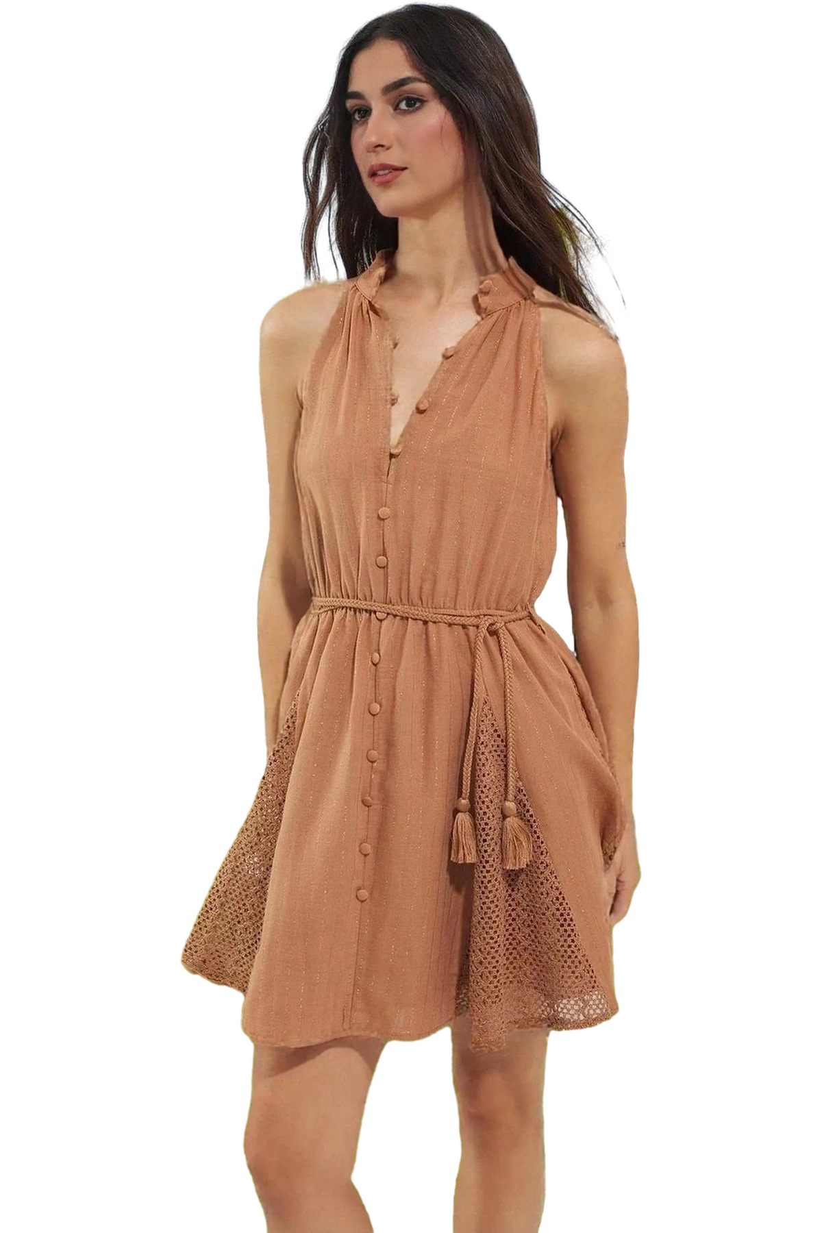 Halter yaka tasarımı ve önündeki düğme detaylarıyla şıklığı yakalarken, volanlı etek kısmı ve alt kısımdaki dantel detaylı fırfır ile feminen bir tarz oluşturur. Beldeki ince kuşak ile belinizin ince görünmesini sağlar. %98 pamuk, %1 metalik iplik ve %1 poliamidden oluşan kumaş yapısı, hem dayanıklı hem de kolay bakım gerektirir. Makinede yıkanabilir olması kullanım kolaylığı sağlar. Modelin ölçüleri: Boy: 181cm(511) Göğüs: 81cm(31in) Bel: 61cm(24in) Kalça: 90cm(35in).
