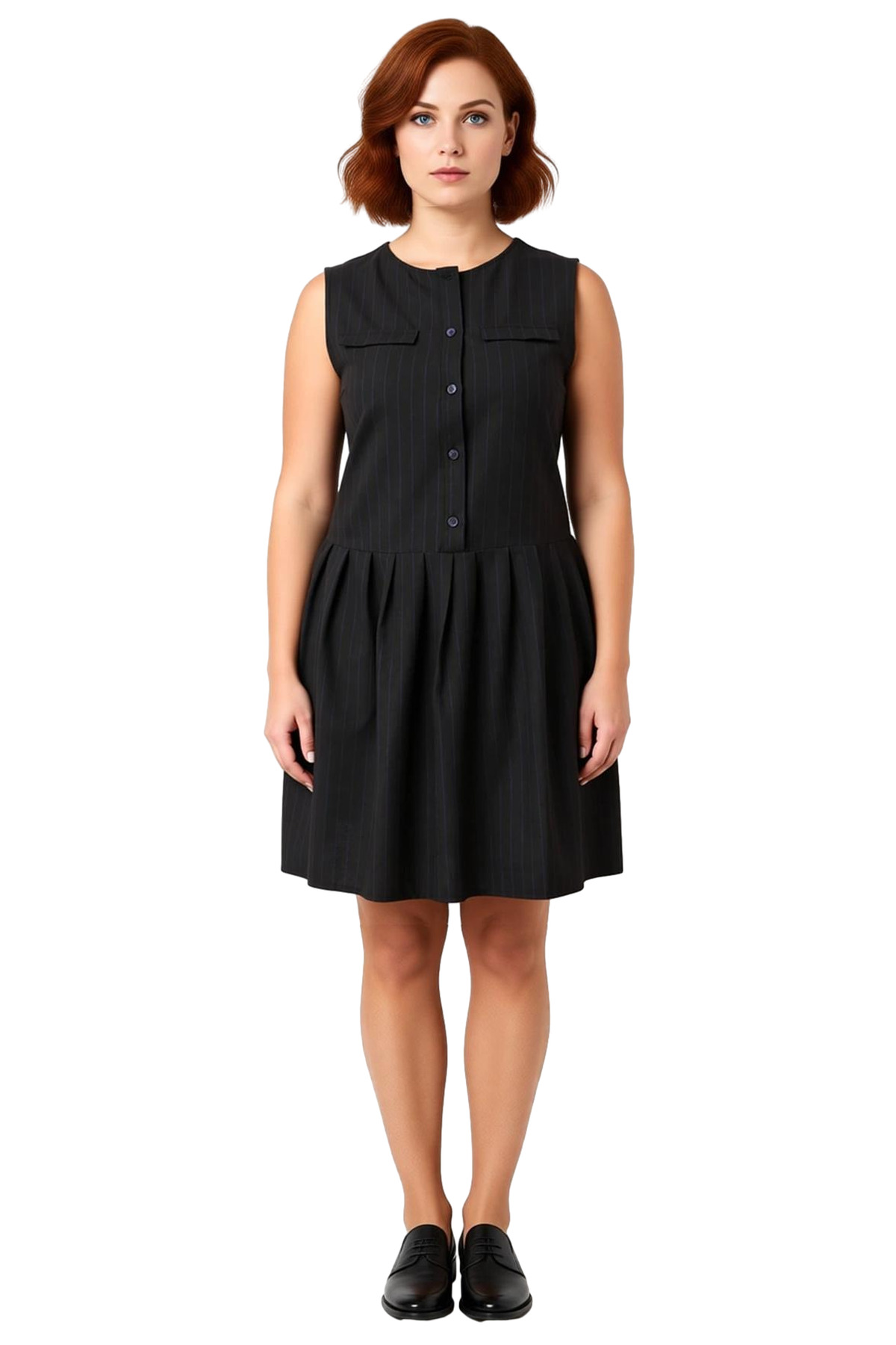 Bu kadın jile elbise, iş ve ofis ortamlarının gerektirdiği şıklığı ve profesyonelliği modern bir dokunuşla birleştirir. Çizgili deseni ve siyah rengi, klasikleşmiş bir zarafet sunarken, dokuma kumaşın kalitesi gün boyu süren konforu garantiler. Poliviskon materyal bileşimi sayesinde hem dayanıklı hem de nefes alabilen bir yapıya sahiptir. Düğme detaylı ön tasarımı, elbiseye karakteristik bir görünüm kazandırırken, kolsuz kesimi İlkbahar ve Sonbahar günleri için idealdir.
