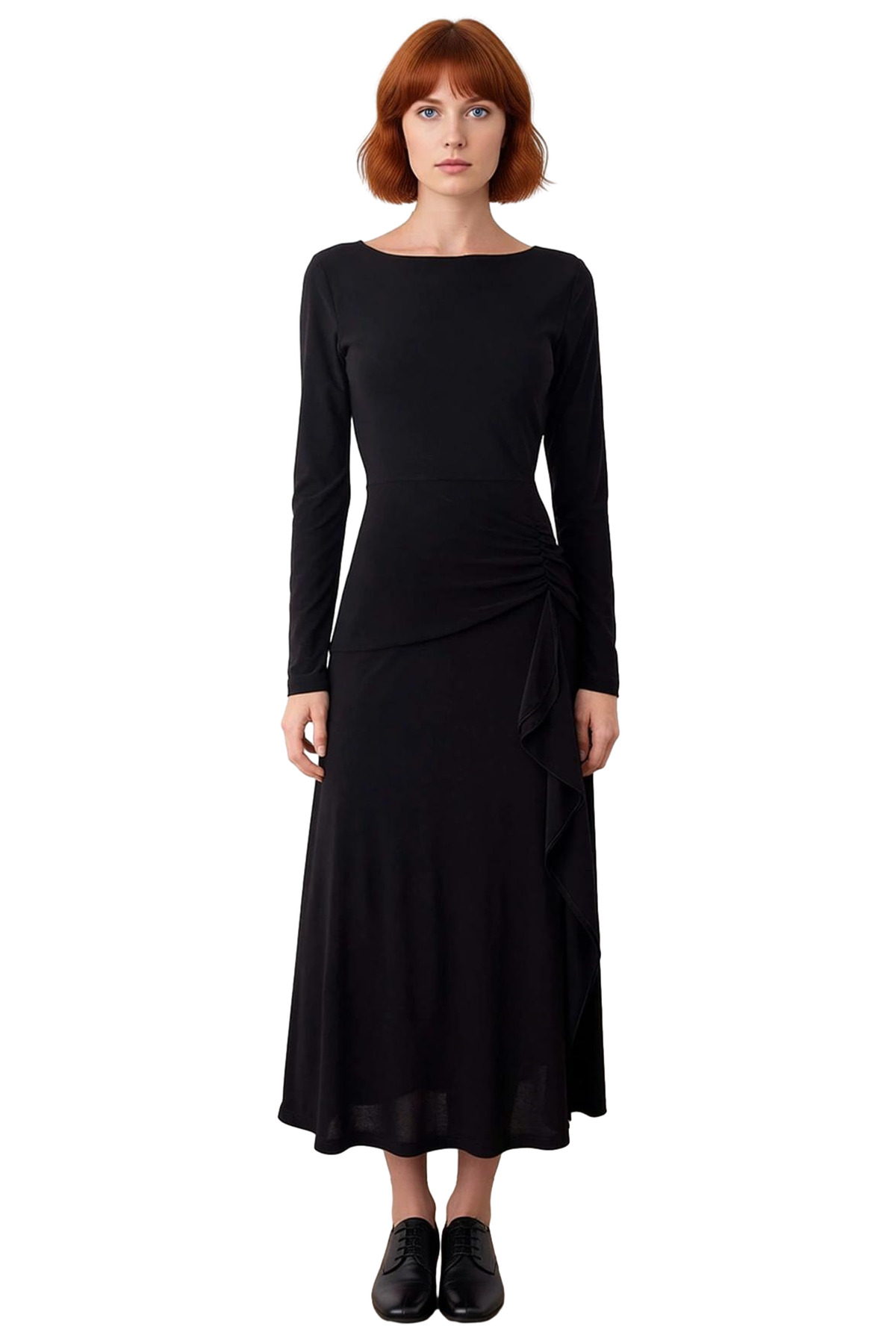 Ürün Özellikleri: A-line kalıp, %95 polyester %5 elastan materyal, düz desen, kayık yaka, standart kol, örme kumaş, siyah renk, büzgü / drape detayı.