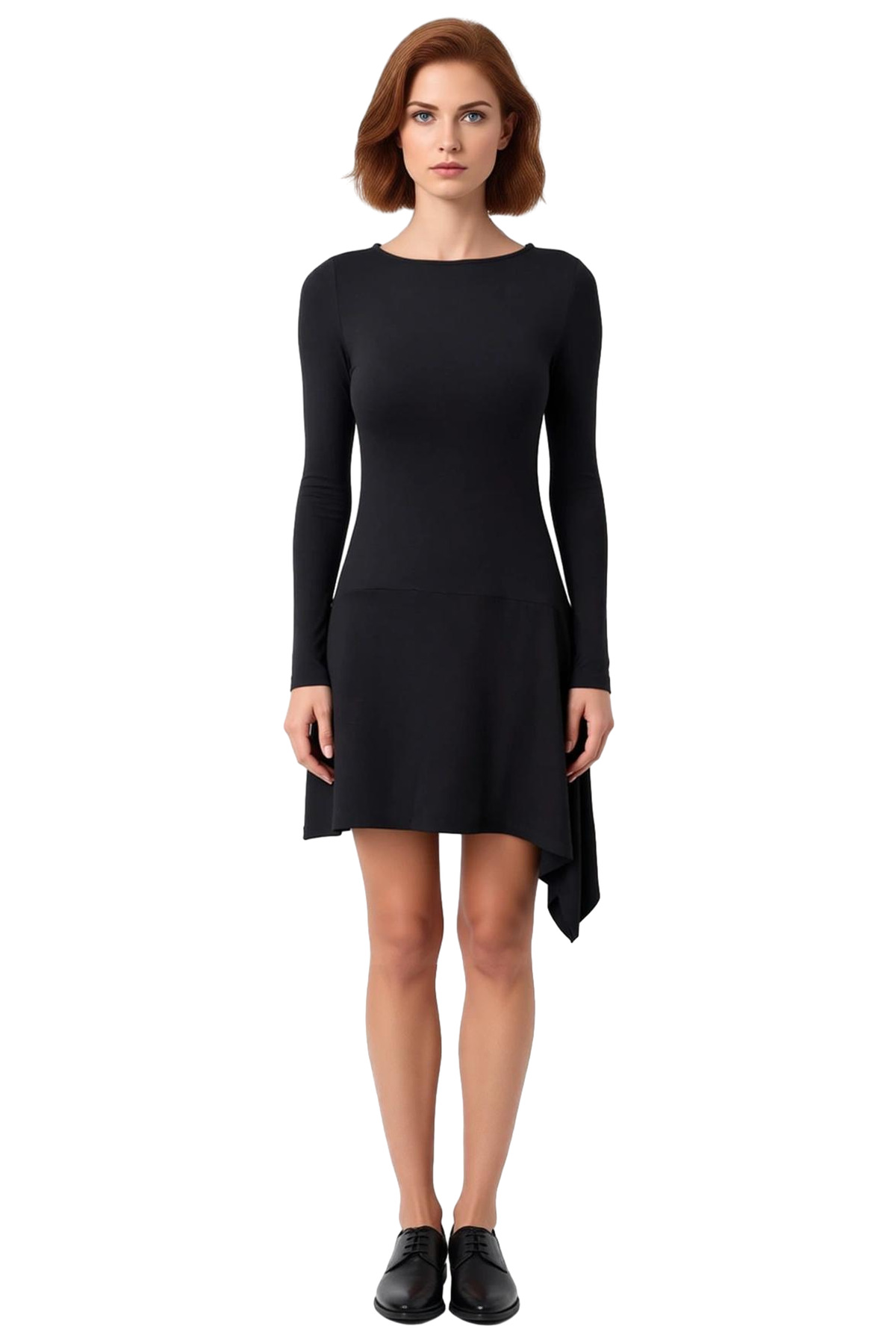 Ürün Özellikleri: Bodycon kalıp, viskoz/elastan materyal, düz desen, kayık yaka, standart uzun kol, örme viskon ribana kumaş, siyah renk, asimetrik siluet.