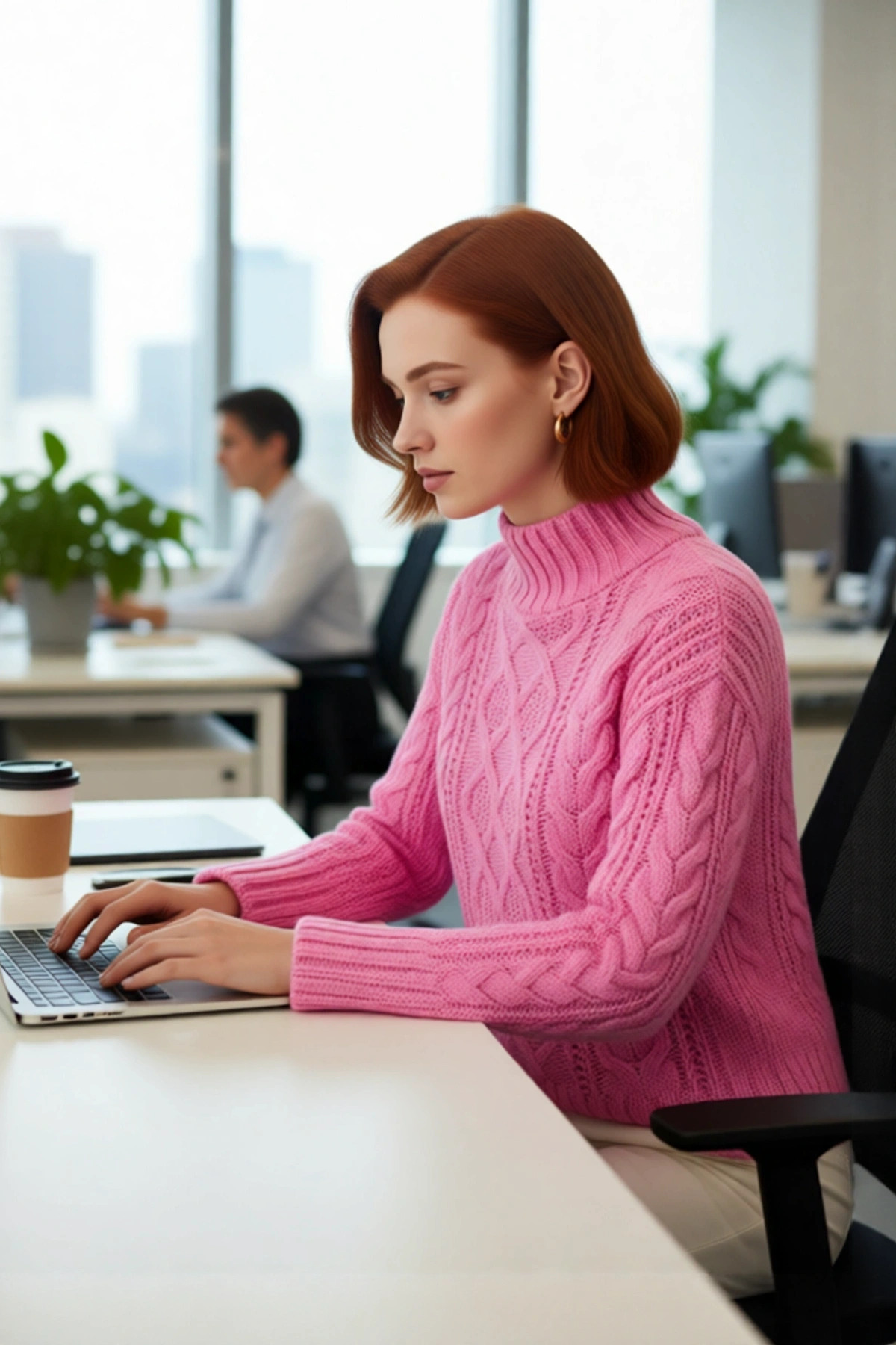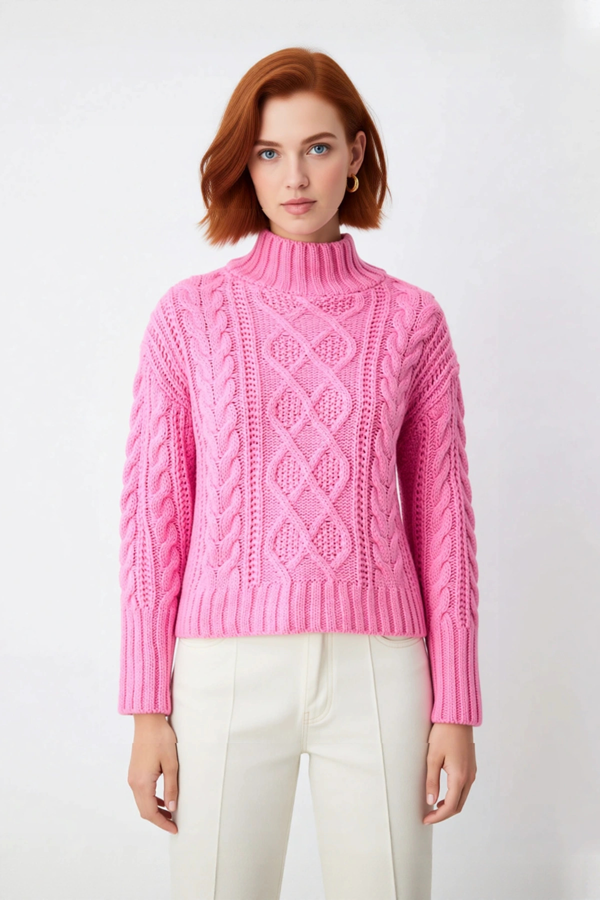 Ürün Özellikleri: Oversize kalıp, akrilik materyal, saç örgü desen, dik yaka, düşük kol, triko kumaş, pembe renk, uzun kol boyu.