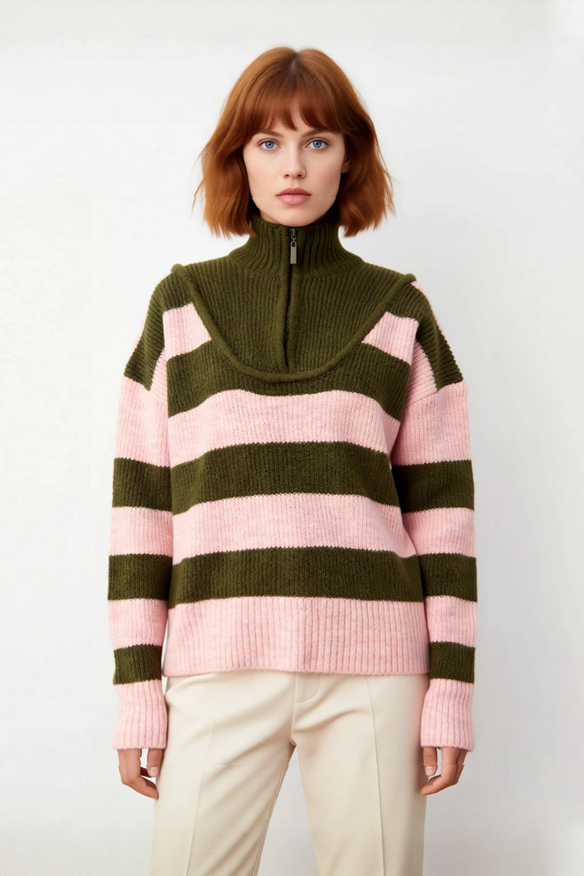 Ürün Özellikleri: Oversize kalıp, akrilik polyester materyal, çizgili desen, dik yaka, düşük kol, triko kumaş, haki pembe renk, selanik dokuma.