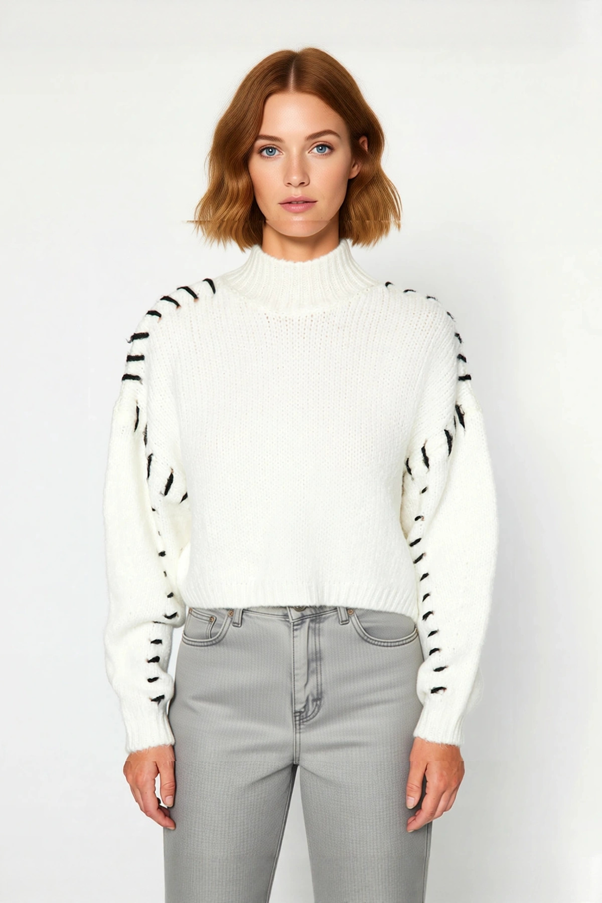 Kadın Oversize Dik Yaka İplik Detaylı Düşük Kol Selanik Triko Kazak Kış Şıklığınıza Konfor Katar