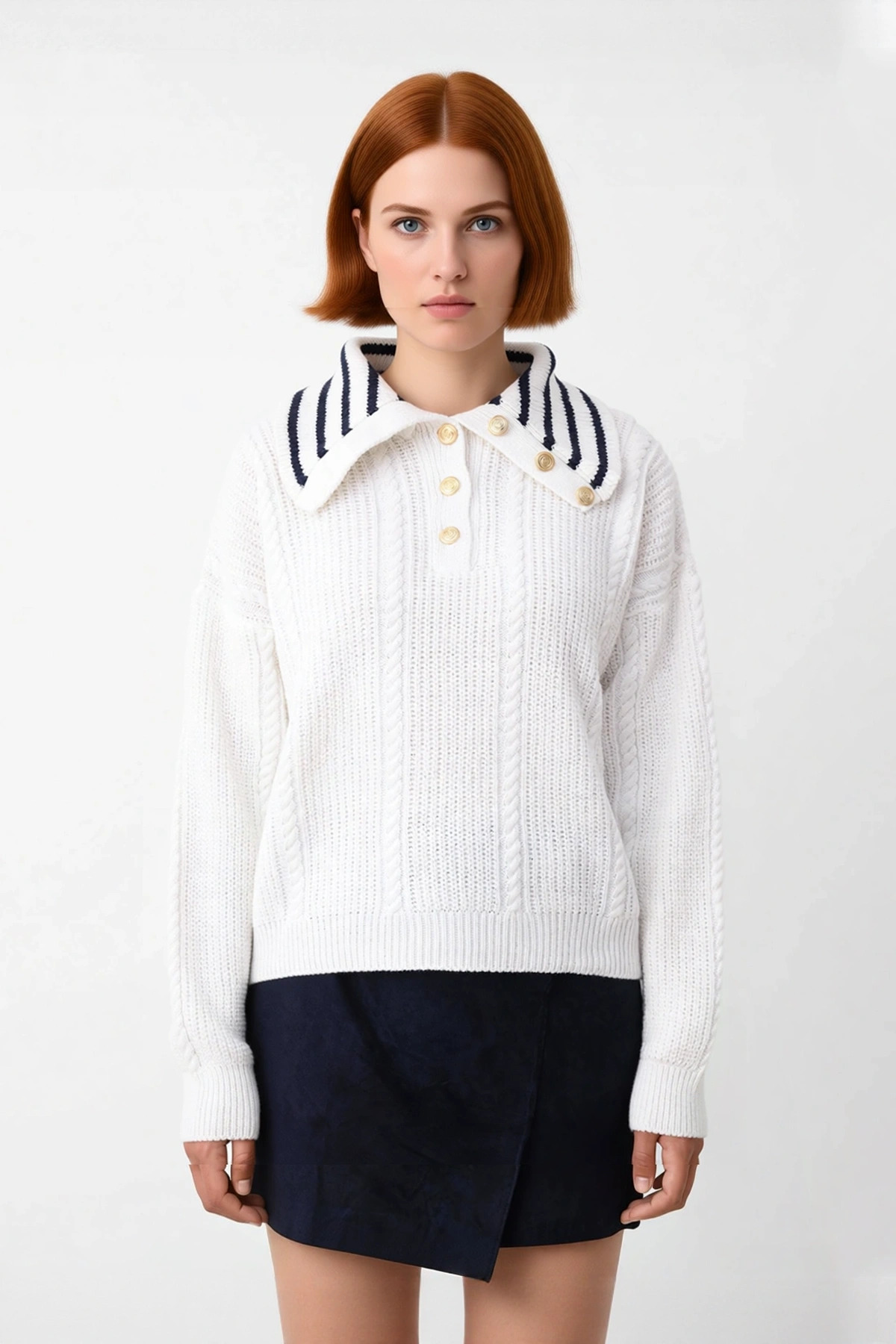 Ürün Özellikleri: Oversize kalıp, %100 akrilik materyal, saç örgülü ve renk bloklu desen, devrik yaka, düşük kol, triko kumaş, ekru renk, Selanik dokuma.