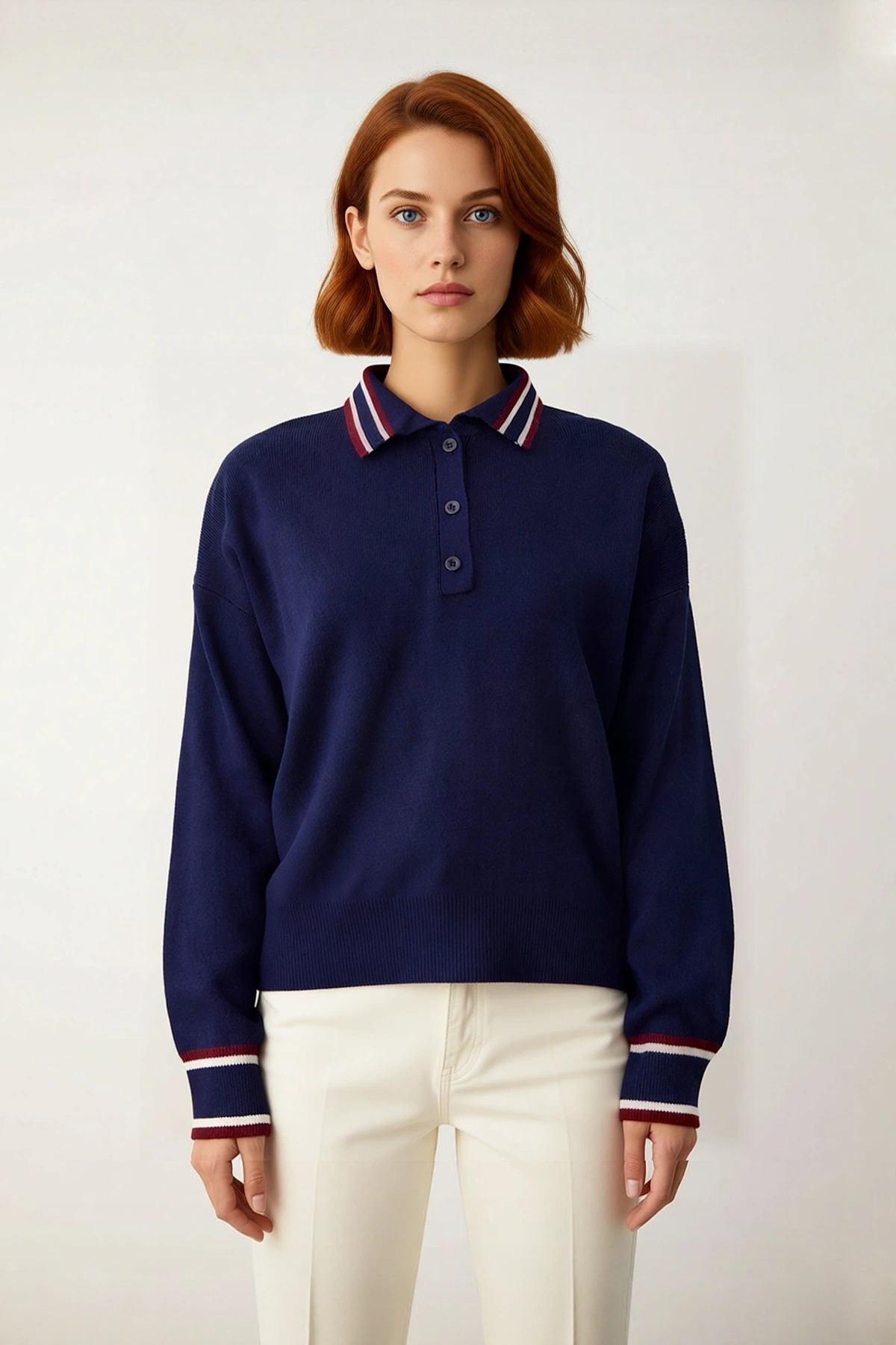 Ürün Özellikleri: Oversize kalıp, %100 akrilik materyal, renk bloklu desen, polo yaka, düşük kol, triko kumaş, lacivert renk, orta kalınlık.