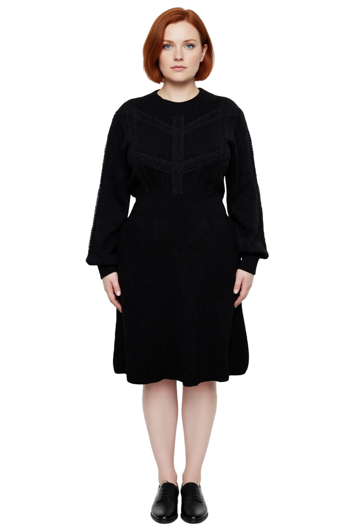 Bu modern kadın triko elbise, oversize kalıbıyla rahatlığı ve şıklığı bir araya getirir. Akrilik materyalden üretilen bu parça, kış aylarının soğuk günlerinde sizi sıcak tutarken, yumuşak dokusuyla gün boyu konfor sunar. Skater silueti, midi boyuyla genç ve enerjik bir hava katarken, aynı zamanda zarif bir görünüm sağlar. Siyah rengi, her gardıropla uyum sağlayarak kolay kombin imkanı sunar. Elbisenin yaka ve kol bölgelerindeki özel örgü detayları, düz tasarıma hareket katıp ürünü sıradanlıktan uzaklaştırır.