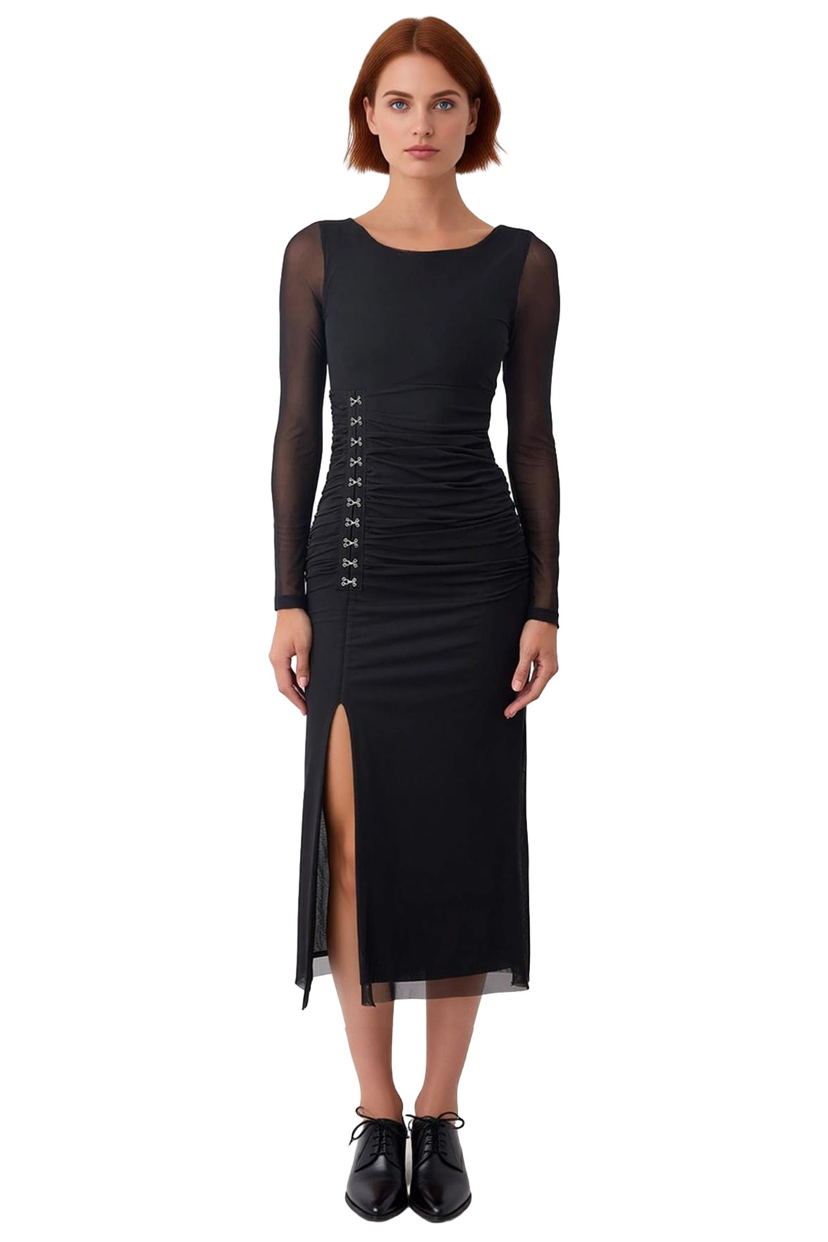 Ürün Özellikleri: Bodycon kalıp, polyester elastan materyal, düz desen, bisiklet yaka, standart kol, örme kumaş, siyah renk, agraflı ürün detayı, maxi boy.