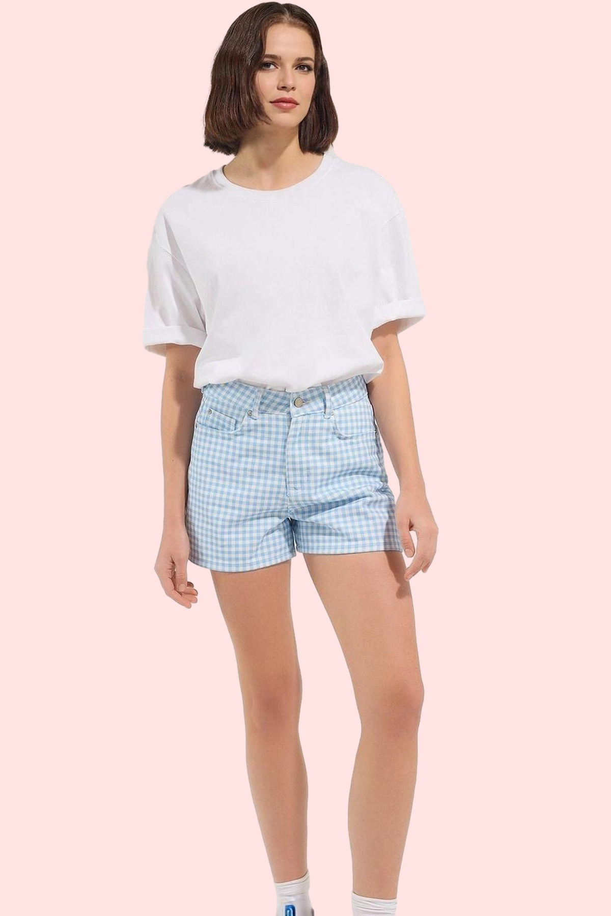 ; Bel: Yüksek Bel; Kalıp: City Short; Kumaş Tipi: Denim; Desen: Ekose / Kareli; Renk: Mavi; Paça Tipi: Boru Paça; Dokuma Tipi: Rigid; Boy: Kısa; Materyal Bileşeni: 100% Pamuk; Yıkama Talimatı: T18; Menşei: TR