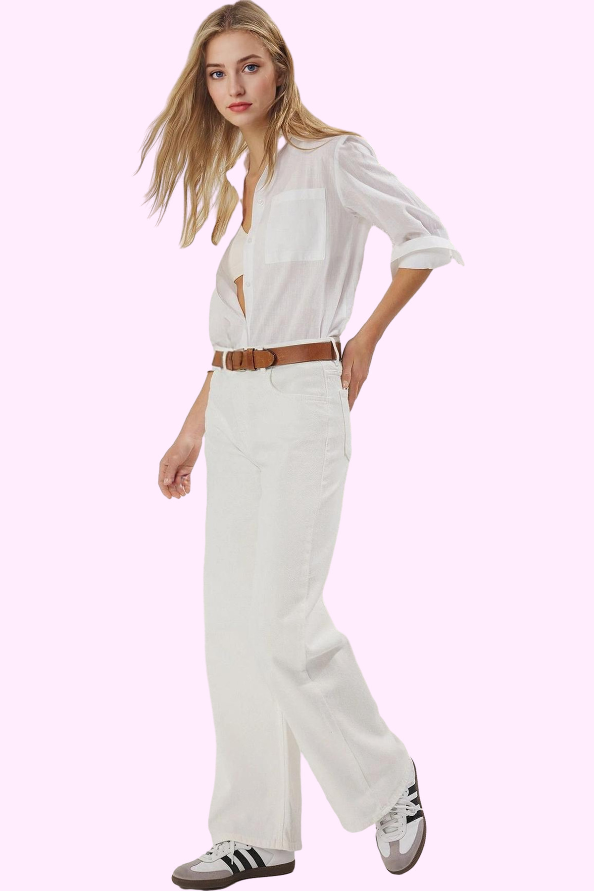 Yazın sıcak günlerinde şıklığı ve rahatlığı bir arada arayan kadınlar için mükemmel bir seçenek olan bu beyaz geniş paça pantolon; %100 pamuk denim kumaşıyla gün boyu konfor sunuyor. Yüksek bel tasarımı ve geniş paça kesimi ile modern ve şık bir görünüm oluştururken, düz deseni her tarza uyum sağlıyor. Nefes alan yapısıyla yaz sıcağında bile rahat hissetmenizi sağlayacak. Günlük kullanım için ideal olan bu pantolon, farklı üst giyim parçalarıyla kolayca kombinlenebilir. Tişörtlerle, bluzlarla veya şık gömleklerle harika bir uyum yakalıyor. Hem günlük hayatta hem de özel günlerde kullanılabilen bu pantolon, gardırobunuzun en çok kullanılan parçası olmaya aday. Makinede yıkanabilir özelliğiyle de oldukça pratik.