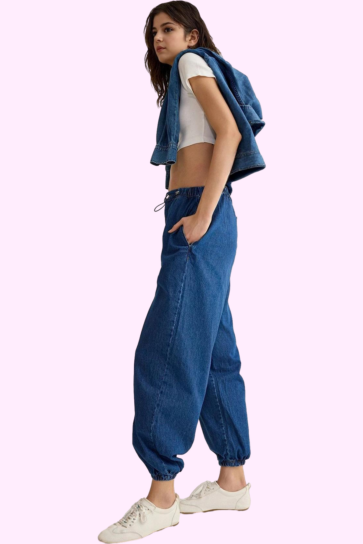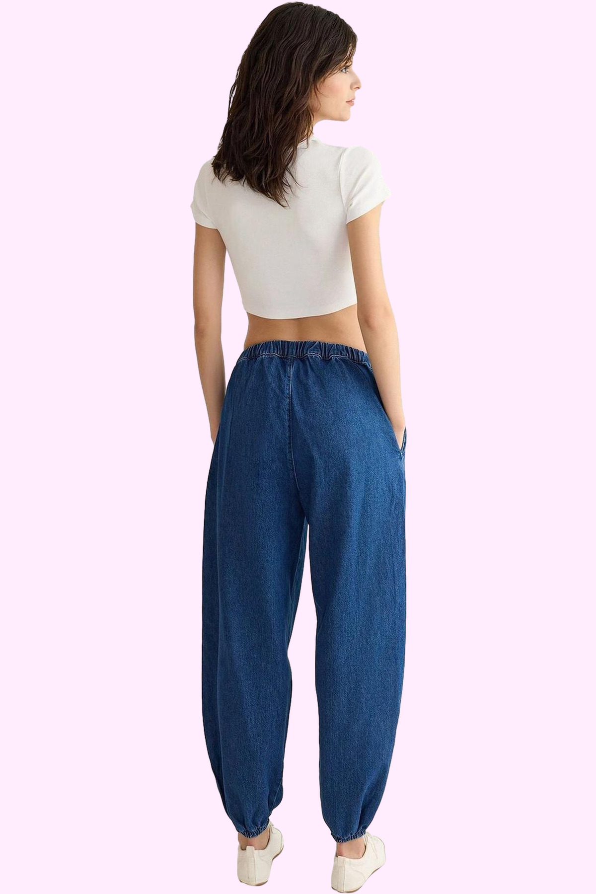 Rahatlığı ve şıklığı bir arada arayan kadınlar için ideal bir seçenek olan bu lacivert jogger pantolon, yüksek kaliteli %100 pamuk kumaştan üretilmiştir. Yüksek bel tasarımı ve jogger kalıbıyla gün boyu konfor sunar. Lastikli paçaları sayesinde hareket özgürlüğünüzü kısıtlamadan şık bir görünüm elde edebilirsiniz. Günlük kombinlerinizde rahatlıkla kullanabileceğiniz bu pantolon, farklı üstlerle kolayca kombinlenebilir. Beyaz bir tişört ve spor ayakkabılarla spor bir şıklık yakalayabilir, ya da şık bir bluz ve topuklu ayakkabı ile daha sofistike bir görünüm elde edebilirsiniz.