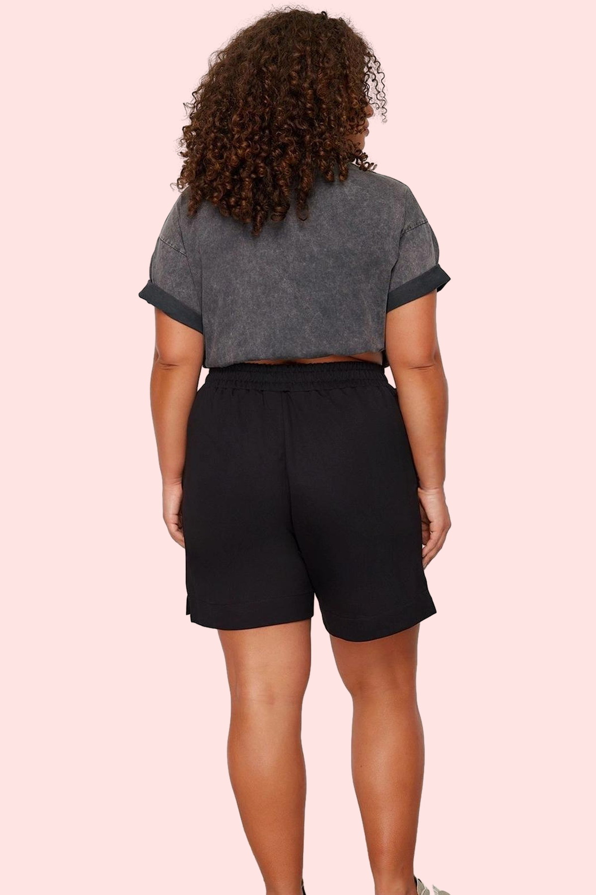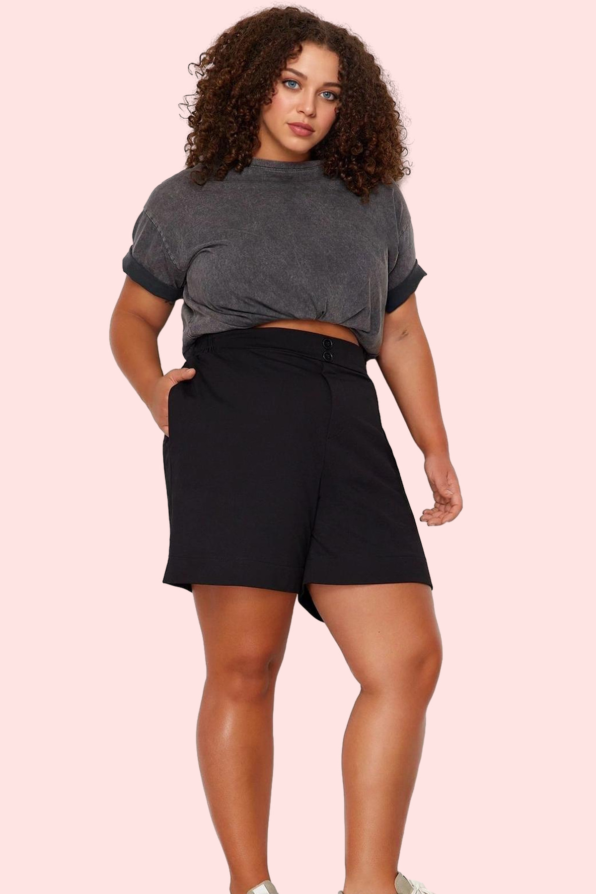 Büyük beden kadınlar için tasarlanan bu siyah şort, yaz aylarında rahatlığı ve şıklığı bir arada sunuyor. %100 pamuk örme kumaştan üretilen şort, yumuşak dokusu ve nefes alabilir özelliğiyle gün boyu konfor sağlar. Yüksek bel tasarımı ve geniş paçası ile vücudunuzu saran, rahat bir kullanım deneyimi sunar. Düz tasarımı ve sade stiliyle her türlü kıyafetinizle kolayca kombinlenebilir. İster şık bir bluzla, ister spor bir tişört ile; bu şort her zaman tarzınıza uyum sağlar.