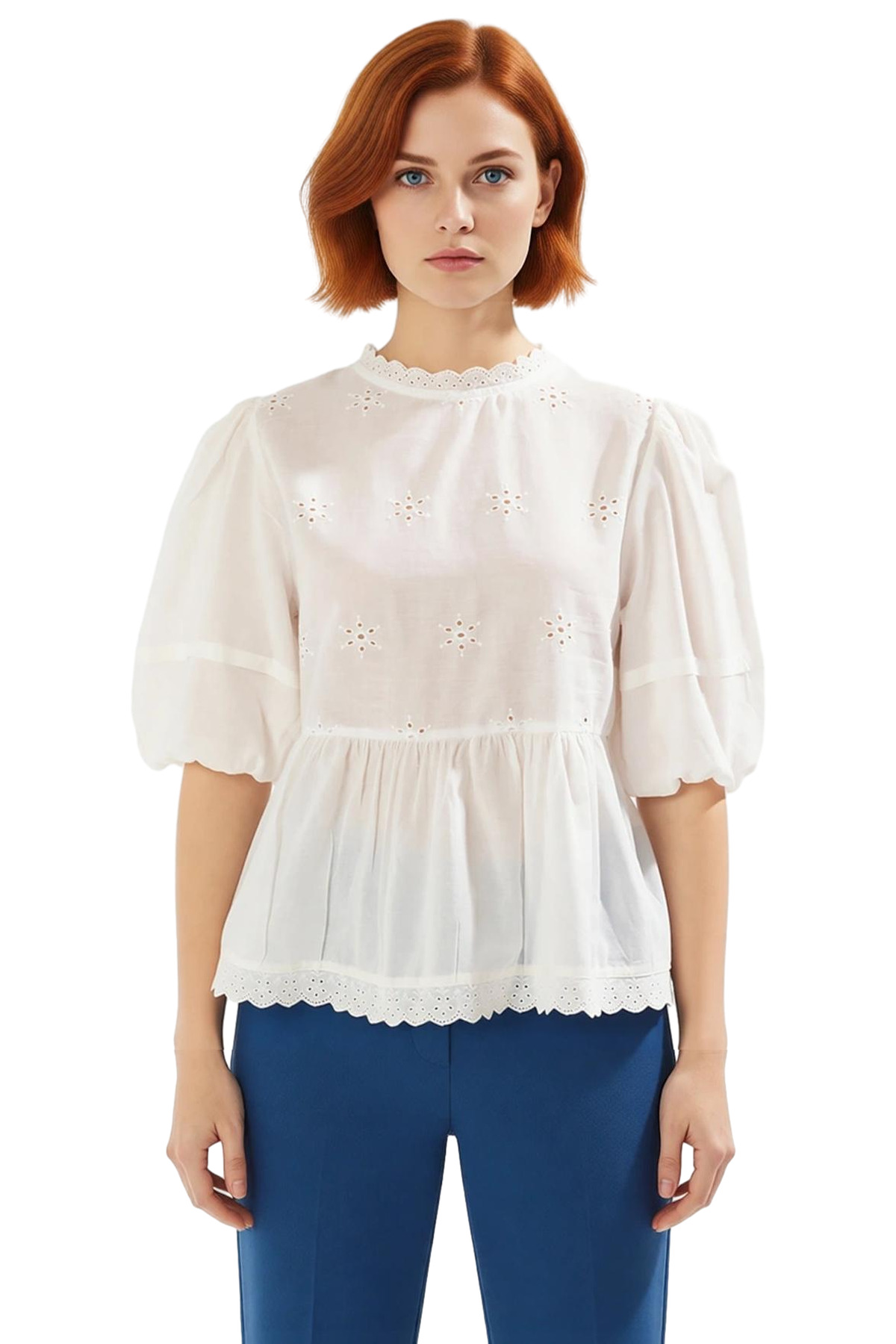 Bu kadın bluzu, %100 pamuk materyali ile üretilmiş olup, dokuma kumaş yapısı sayesinde gün boyu süren bir konfor ve nefes alabilirlik sunar. Üzerindeki zarif brode dokuma detayı, ürüne eşsiz bir estetik katmaktadır. Bisiklet yaka tasarımı, klasik ve zarif bir görünüm sağlarken, balon kol detayı modern ve trend bir siluet oluşturur. Kısa kol boyu, özellikle yaz ayları için ideal bir tercih olup, hareket özgürlüğü sunar. Bluzun fitted kalıbı, vücudu nazikçe sararak şık bir duruş sergiler. Düz deseni ve basic silueti, bu parçayı farklı kıyafetlerle kolayca kombinlenebilir hale getirir. Casual ve günlük ortamlar için tasarlanmış olan bu bluz, şıklığınızı ön plana çıkaracaktır. Brode dokuma tipi, ürüne ince detaylar ve sofistike bir dokunuş ekler. Bu bluz, serin ve rahat bir stil arayan kadınlar için mükemmel bir seçenektir. Ürün, Türkiye’de üretilmiştir ve yıkama talimatları T01 olarak belirtilmiştir. Bu zarif bluz, gardırobunuzun temel parçalarından biri olmaya adaydır. Hem şık hem de rahat olmak isteyen kadınlar için biçilmiş kaftandır. Farklı alt giyim ürünleriyle kolayca kombinlenebilir ve her ortamda dikkat çekmenizi sağlar. Brode detaylarının inceliği ve işçiliği, ürüne değer katmaktadır. Pamuklu yapısı sayesinde cildinize dosttur ve gün boyu konfor sunar. Bu bluz, hem günlük kullanımda hem de özel günlerde tercih edilebilecek şık bir alternatiftir. Balon kol detayı, hareket özgürlüğü sağlarken aynı zamanda feminen bir görünüm sunar. Bisiklet yaka, her yaşa ve tarza hitap eden zamansız bir yakadır. Bu ürün, kalite ve şıklığı bir arada sunarak kadınların beğenisine sunulmuştur. Üretim yeri Türkiye’dir ve kalitesiyle öne çıkmaktadır. Bu bluz, her kadının gardırobunda bulunması gereken temel parçalardan biridir. Günlük şıklığınızı bir üst seviyeye taşımak için ideal bir seçimdir.