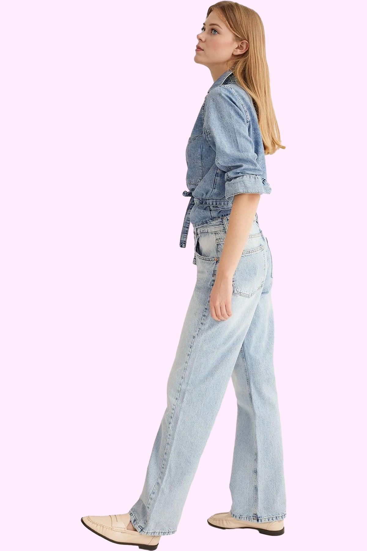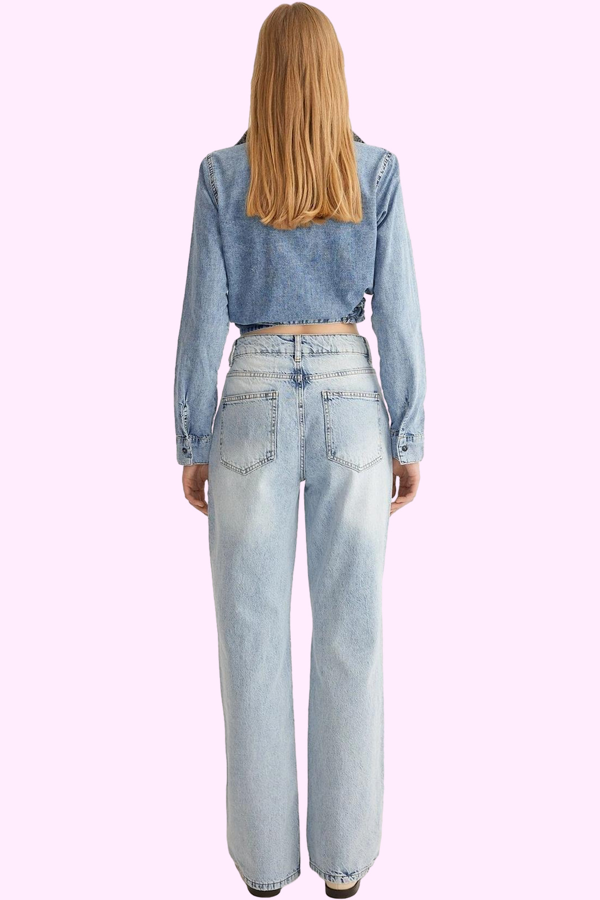 Bu sezonun trend parçası, %100 pamuklu, mavi denim geniş paça pantolon ile tanışın! Yüksek bel tasarımı ve rahat kesimi ile gün boyu konfor sunarken, geniş paçası ile modern ve şık bir görünüm oluşturmanıza yardımcı olacak. Casual ve günlük bir stile sahip bu pantolon, dolabınızdaki diğer parçalarla kolayca kombinlenebilir. Pamuk kumaşının yumuşak dokusu ve nefes alabilir yapısı ile yaz aylarında da rahatlıkla kullanabilirsiniz. Ütü gerektirmeyen yapısı sayesinde ise zamanınızdan tasarruf etmenizi sağlar.