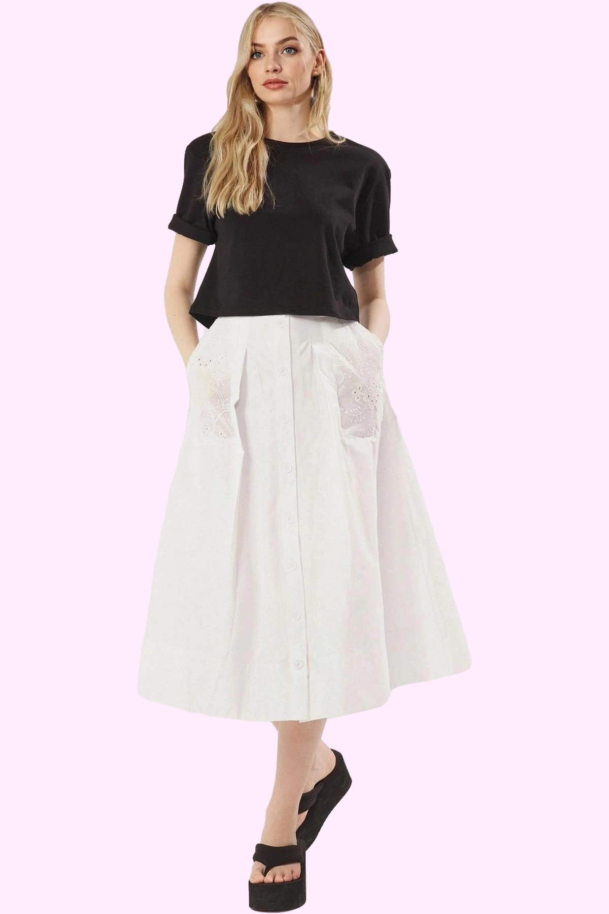 Rahatlığı ve şıklığı bir arada sunan bu beyaz pamuklu maxi etek, yaz günlerinizin en gözde parçası olacak. A-line kesimi sayesinde vücut tipinize mükemmel uyum sağlar ve her zaman zarif görünmenizi garanti eder. Nefes alabilen yapısı ile gün boyu konfor sunarken, kullanışlı cep detayları pratiklik katıyor. Düğme detaylı ön kısmı ile hem modern bir görünüm sağlarken hem de kolayca giyip çıkartabilirsiniz. Bu etek, hem günlük yaşamda hem de özel günlerde şıklığınıza şıklık katacaktır.