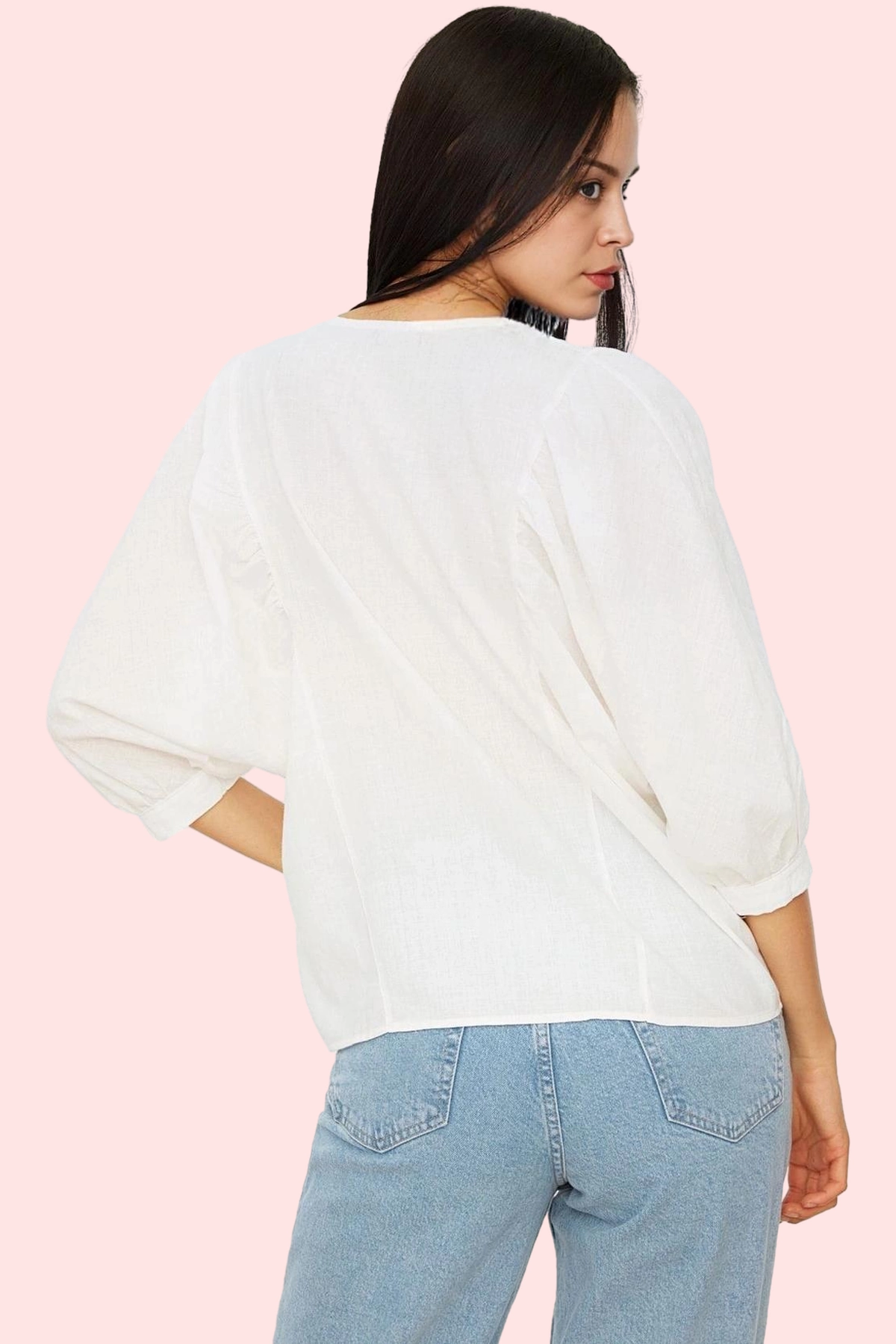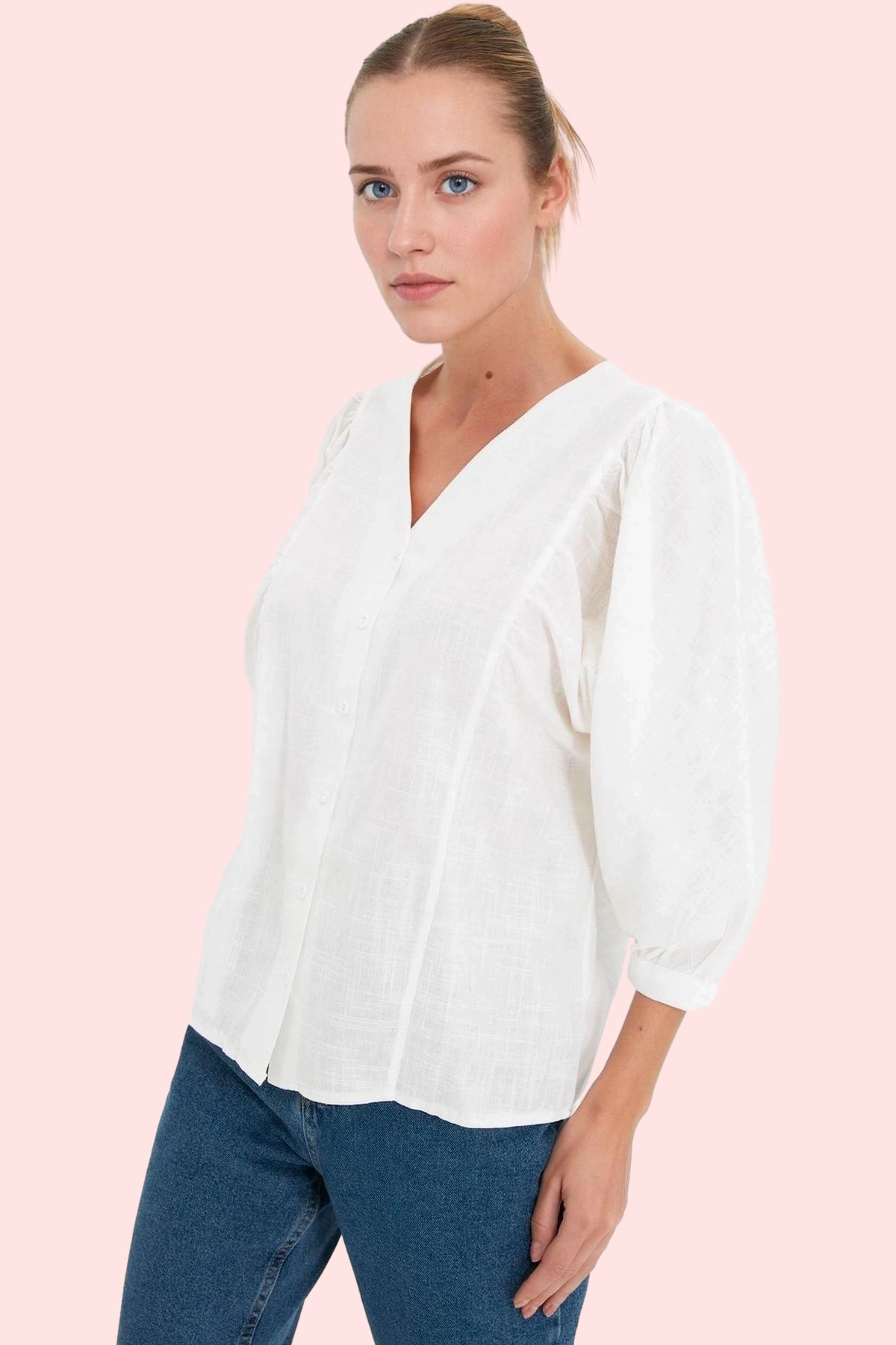 Nefes alabilen %100 pamuk kumaştan üretilen bu beyaz gömlek, hem iş hayatınızda hem de günlük yaşamınızda şık ve rahat bir seçenek sunuyor. V yaka tasarımı ve basic siluetiyle her ortama uyum sağlarken, balon kolları ve regular kalıbıyla modern ve feminen bir tarz yaratmanıza yardımcı olur. Truvakar kol boyu, her mevsim kullanım olanağı sunar. Düz deseni sayesinde her kıyafetinizle kolayca kombinleyebilirsiniz.