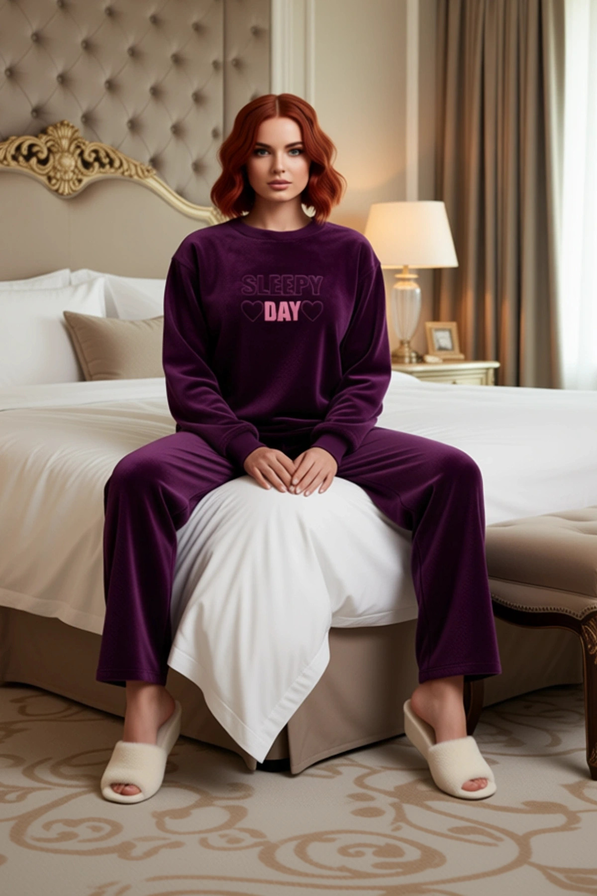 Kadın Peluş Pijama Takımı Slogan Detaylı Fonksiyonel Dayanıklı Kaliteli Konforlu Estetik Şık