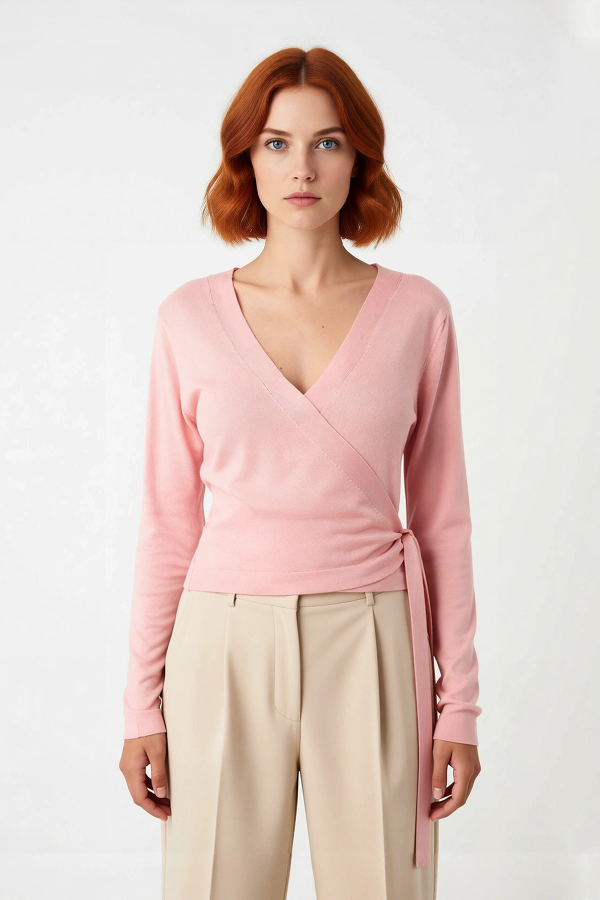 Ürün Özellikleri: Regular kalıp, akrilik viskoz materyal, düz desen, kruvaze yaka, standart kol, triko kumaş, pembe renk.