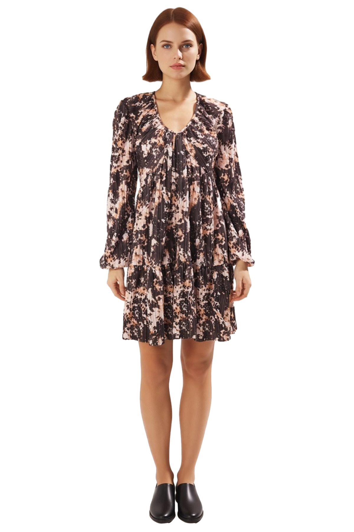 Ürün Özellikleri: Skater kalıp, polyester materyal, soyut desen, V yaka, balon kol, örme kumaş, çok renkli, büzgü/drape detay.